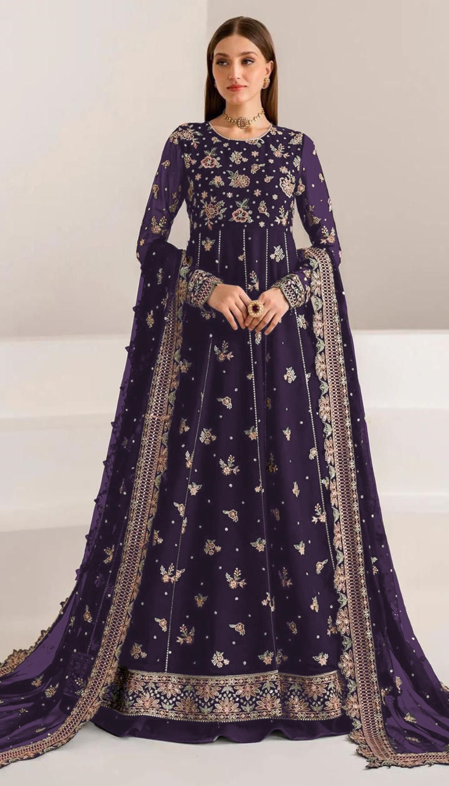 Purple Fauk Gerogette Sequence Embroidered Semi Stitched Salwar Suit