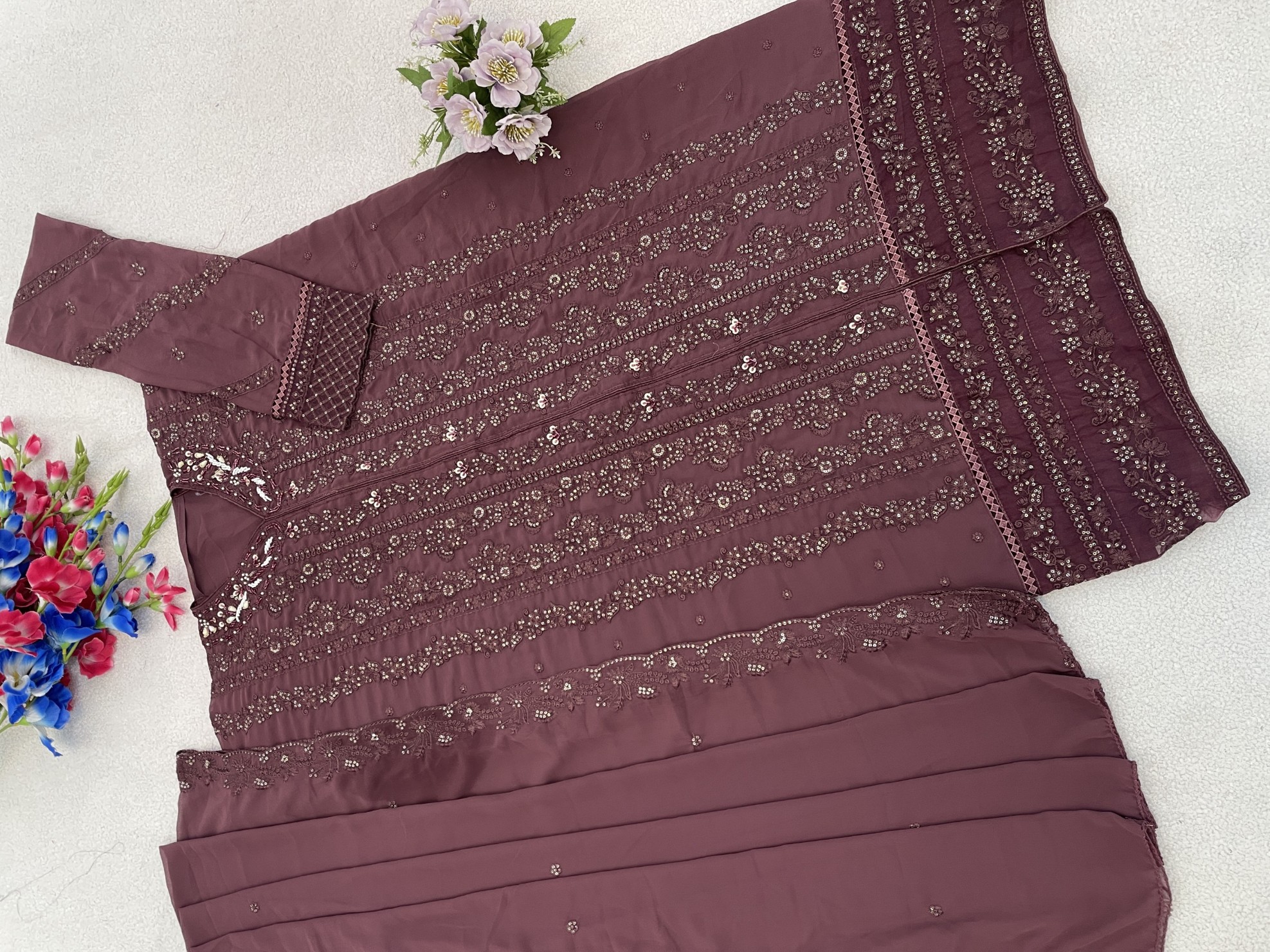 Purple Fox Georgette Semi Stiutched Suit with Embroidery Sequenc & Khatli Work