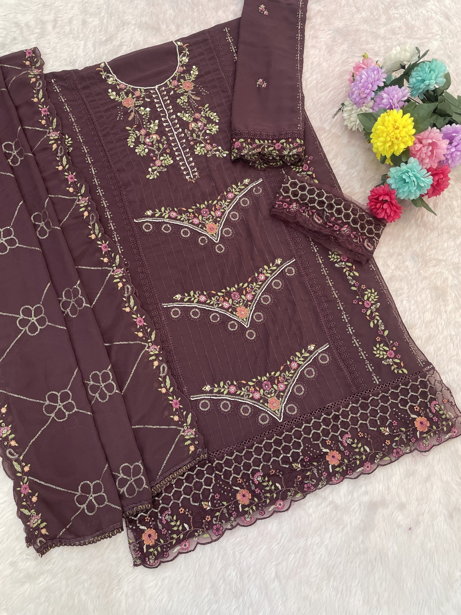 Purple Fox Georgette Semi Stiutched Suit with Embroidery Sequenc & Khatli Work