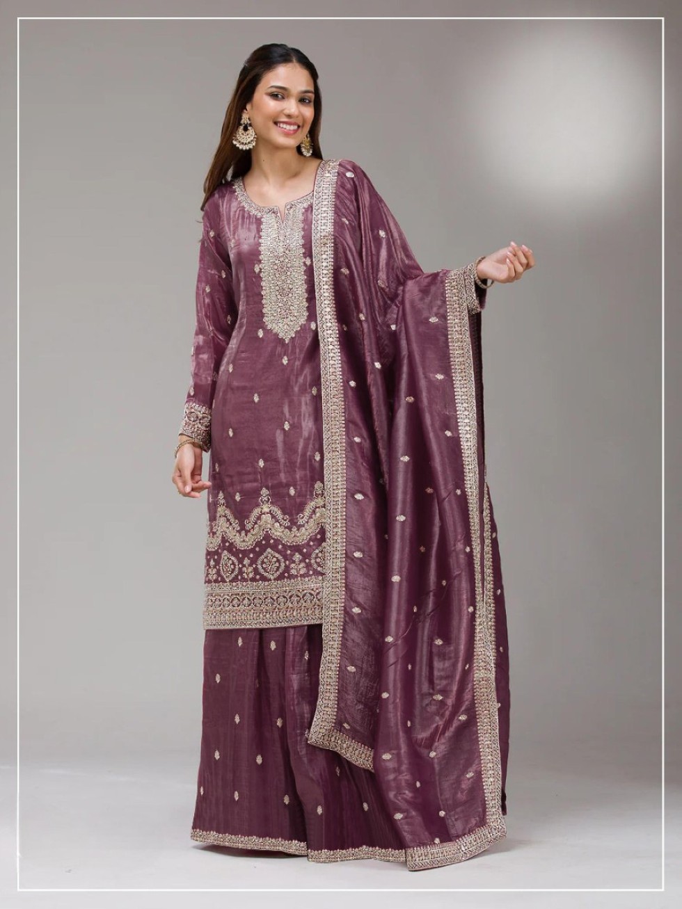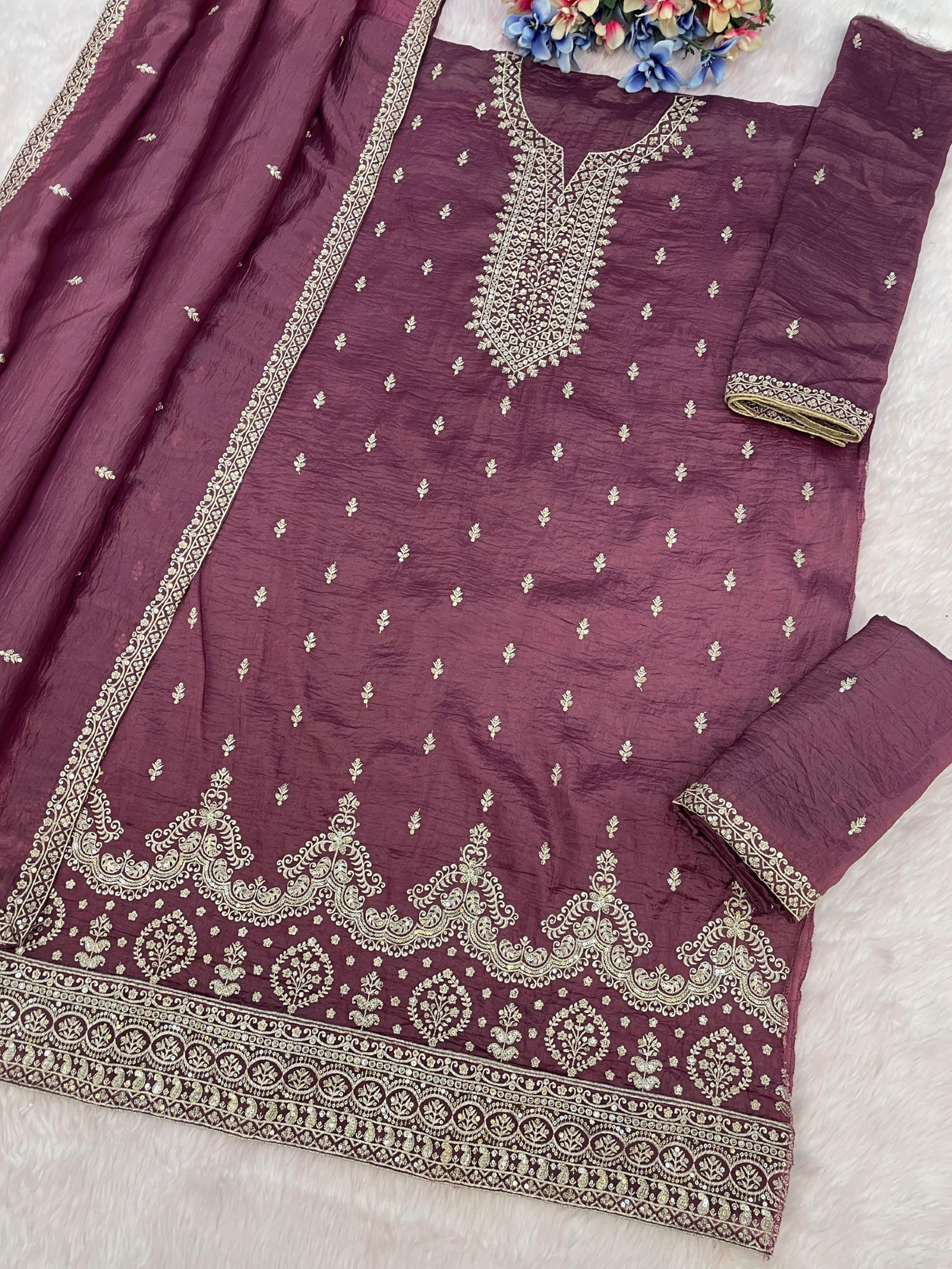Purple Gold Crush Semi Stitched Suit with Embroidery & Sequence Work