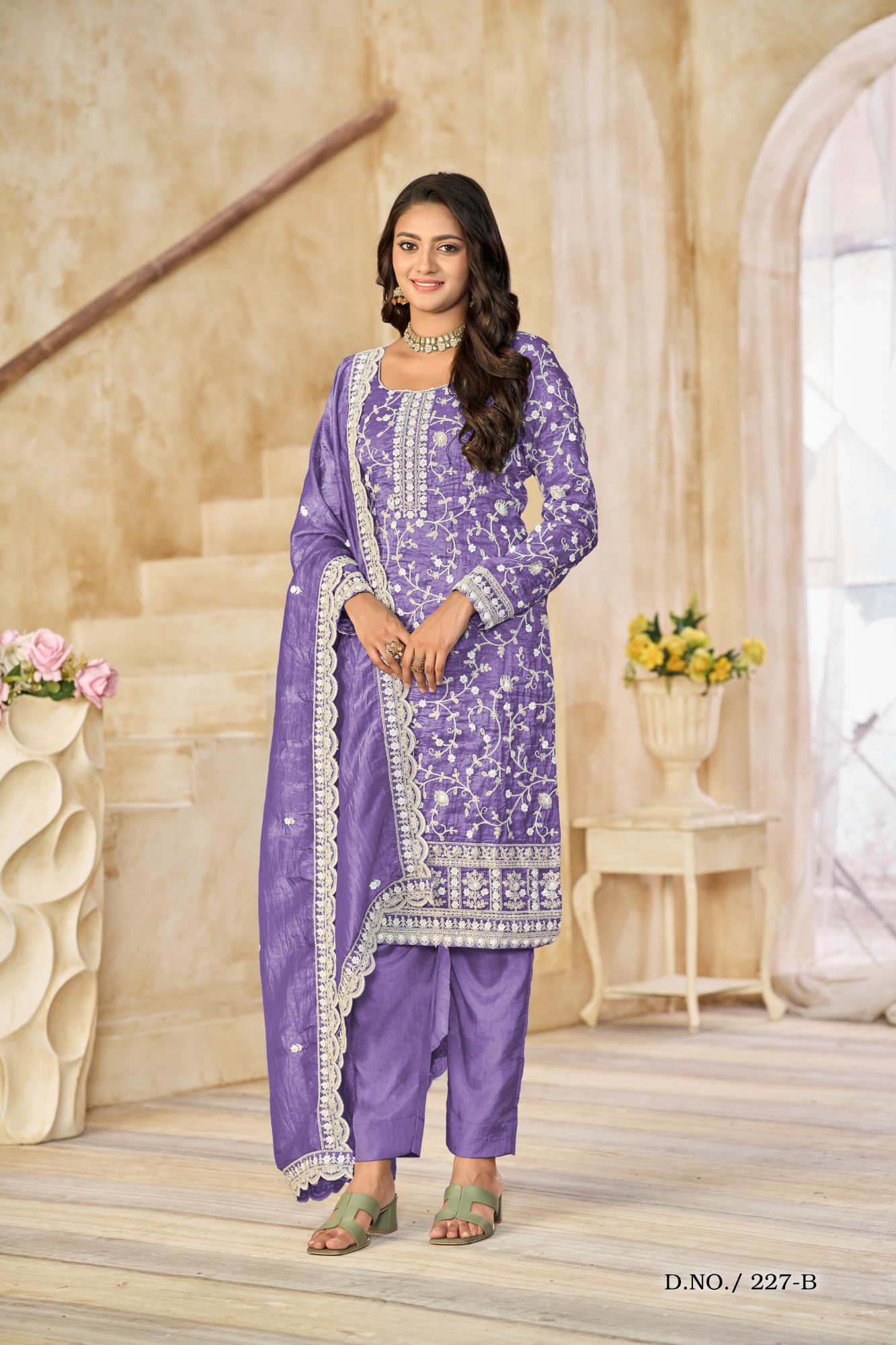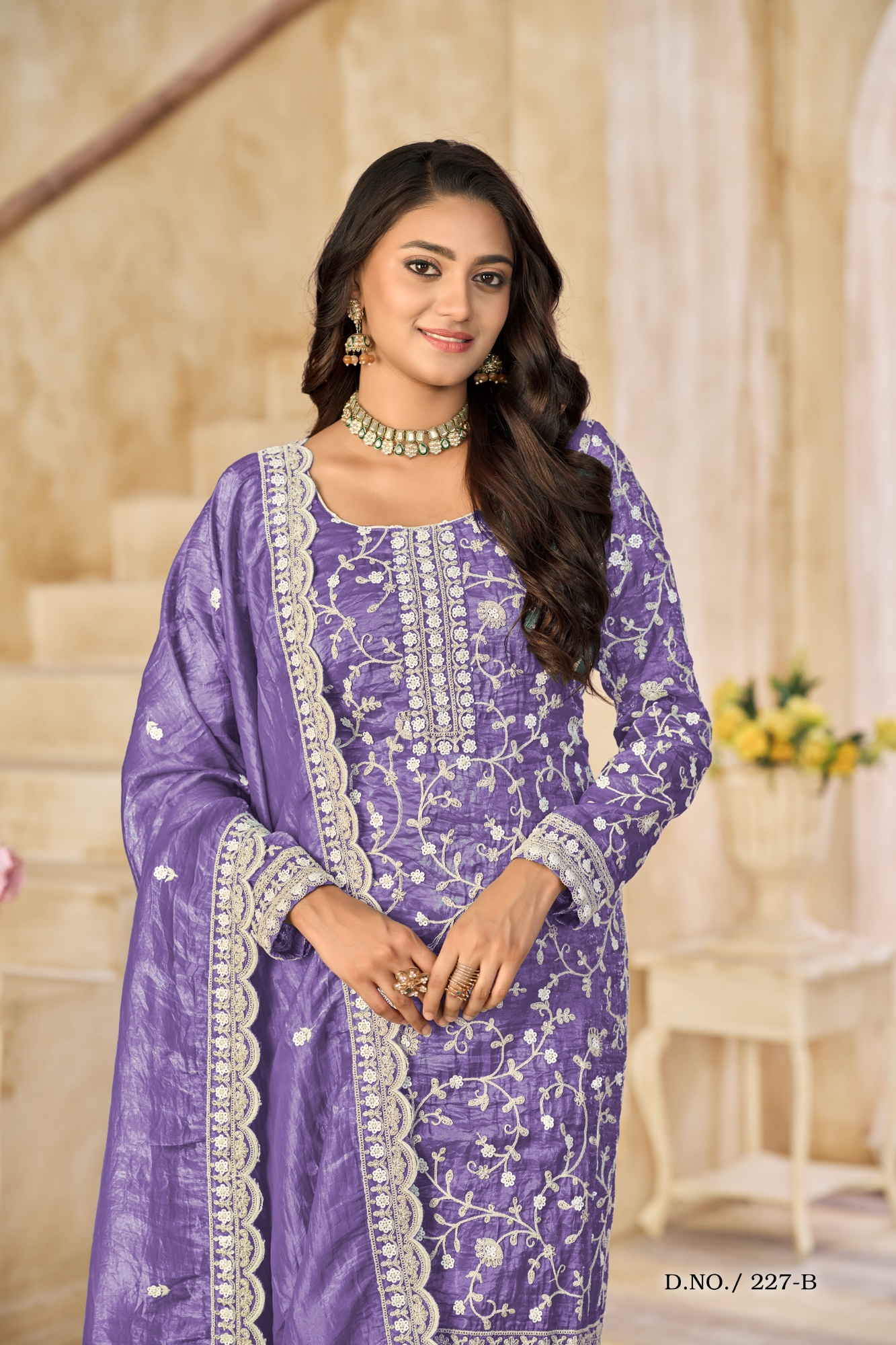 Purple Organza Crush Semi Stitched Suit with Embroidery Work