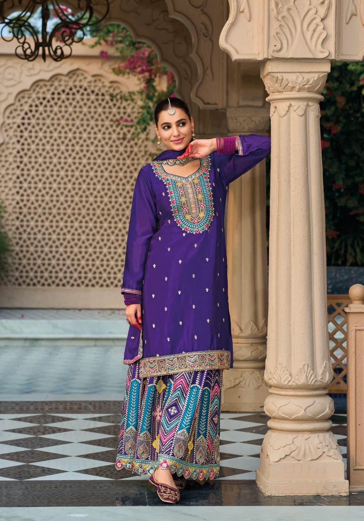 Purple Premium Embroidered Chinon Readymade Salwar Suit (Free Size)