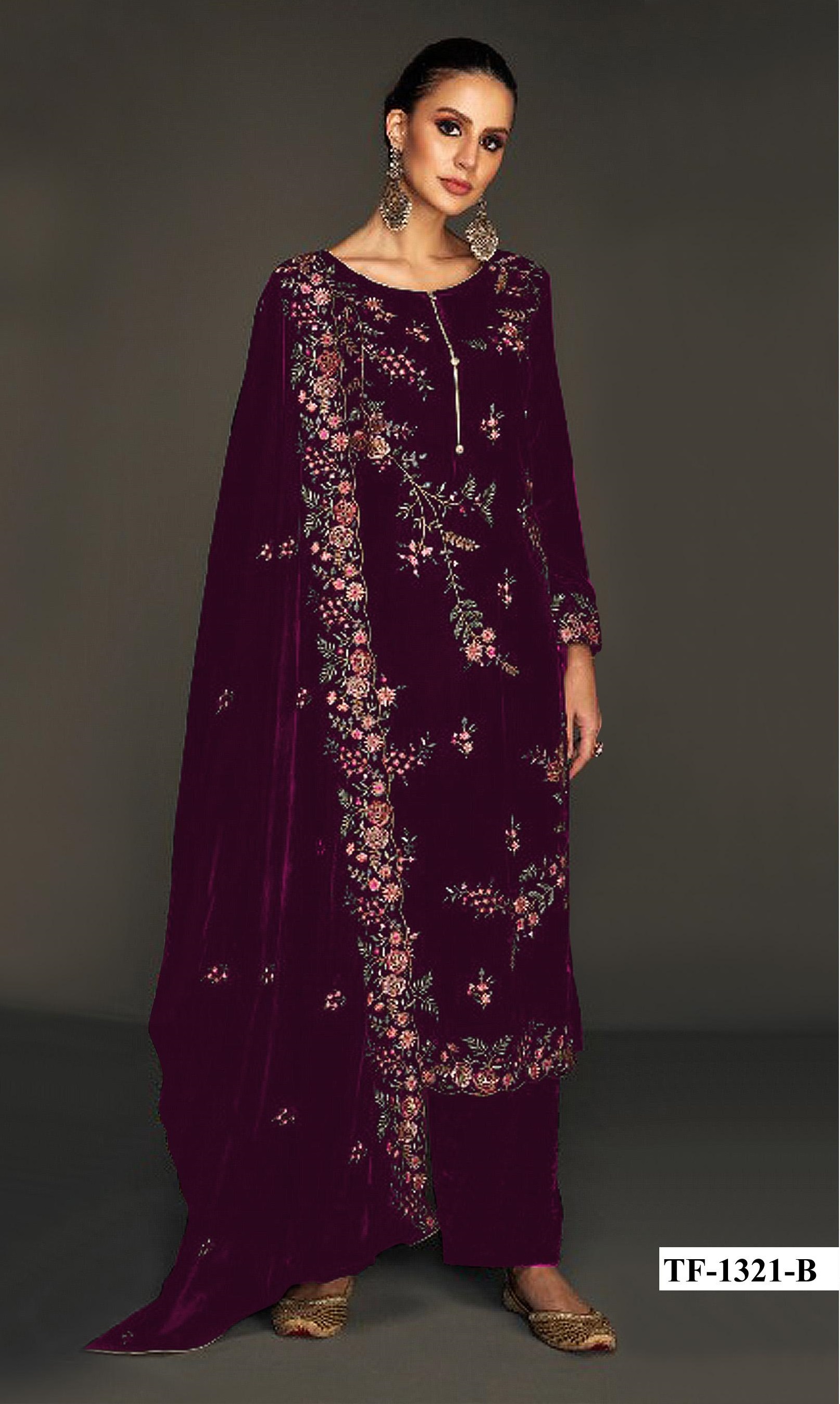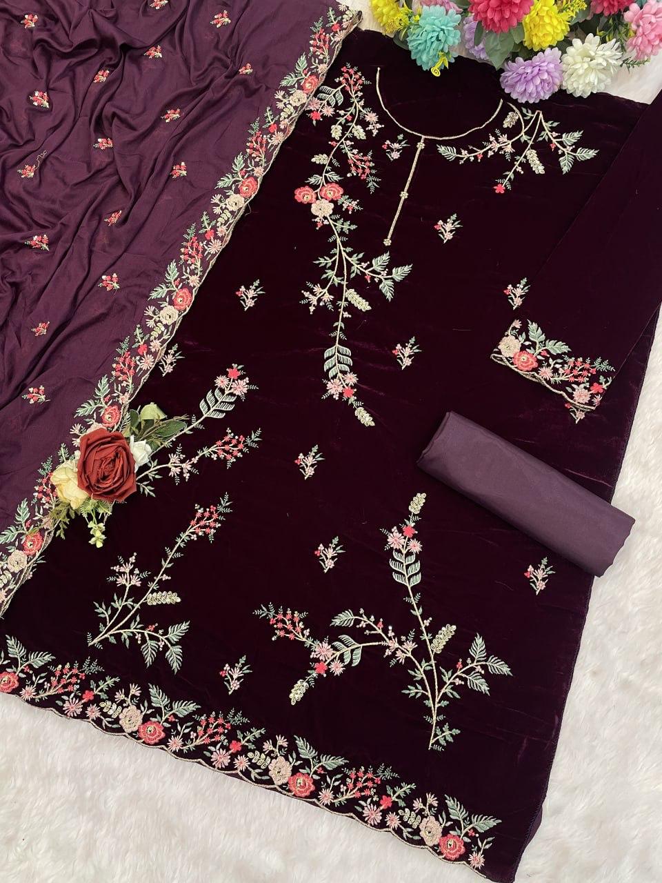 Purple Pure Velvet Semi Stitched Suit with Heavy Embroidery Sequence Work