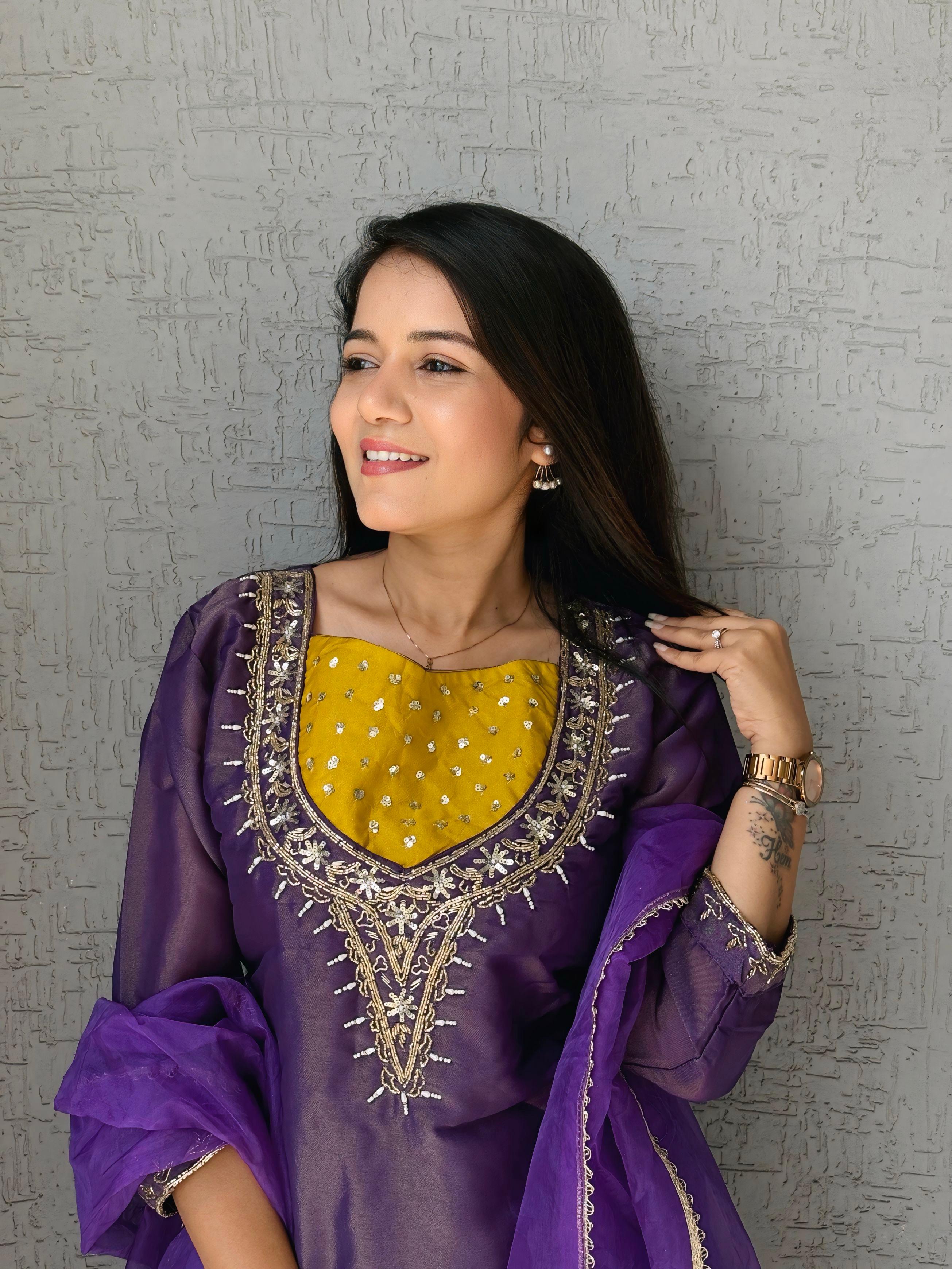 Purple Roman Shimmer Readymade Kurti Set with Handwork & Moti Work