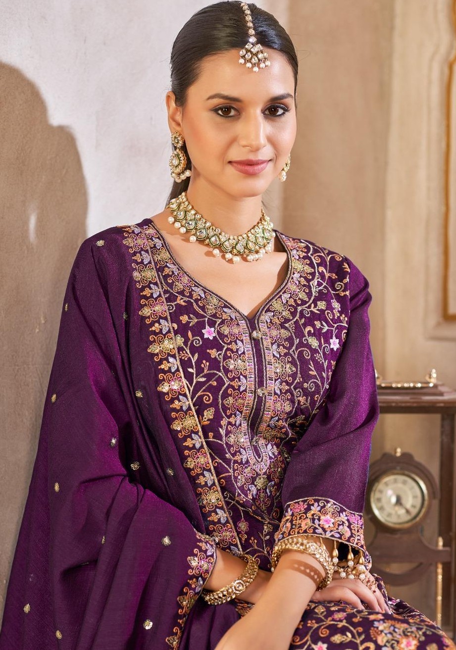 Purple Vichitra Silk Readymade Suit with Embroidery & Lace Work