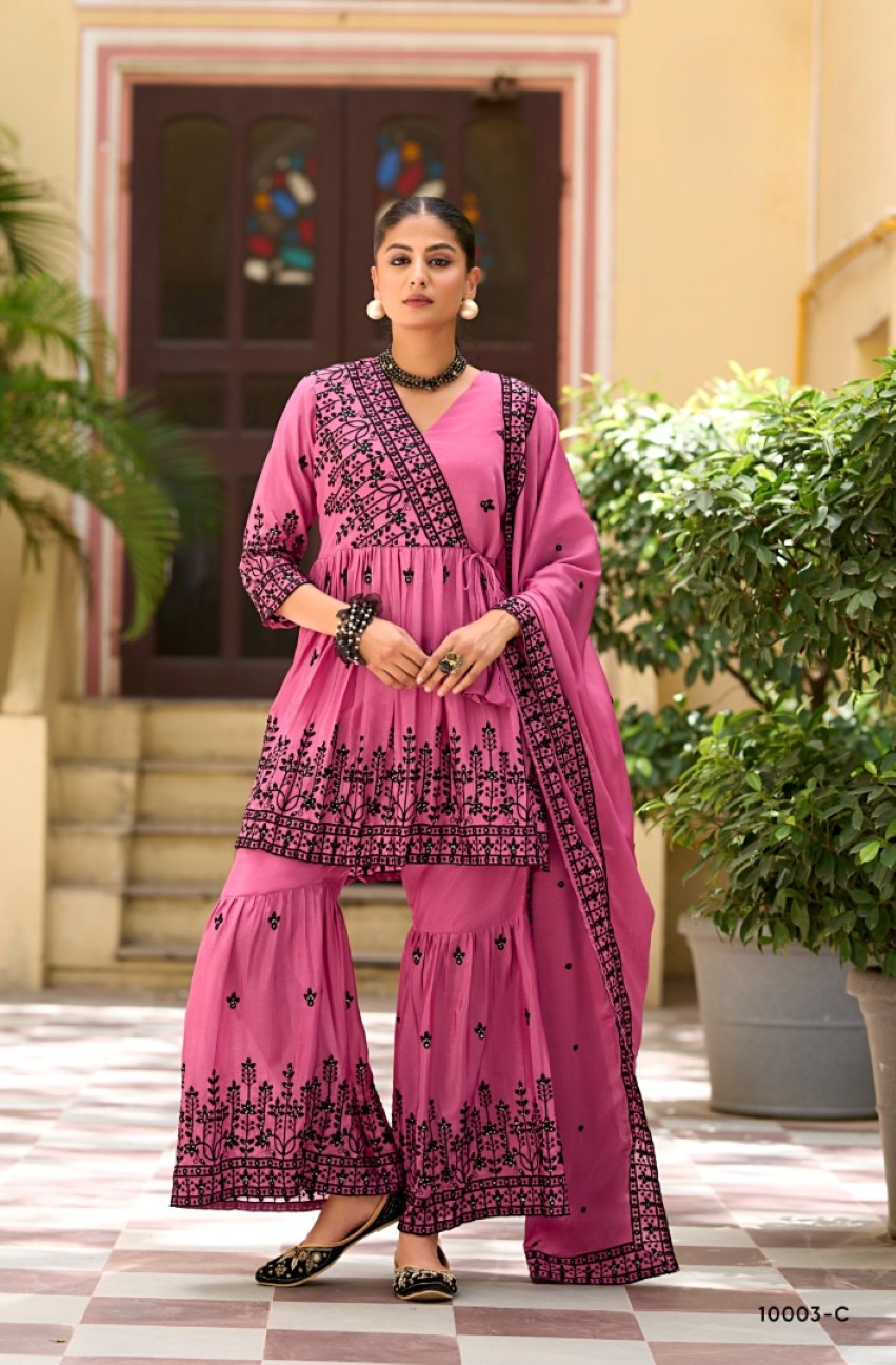 Rani Pink Chinon Readymade Sharara Suit with Embroidery Work