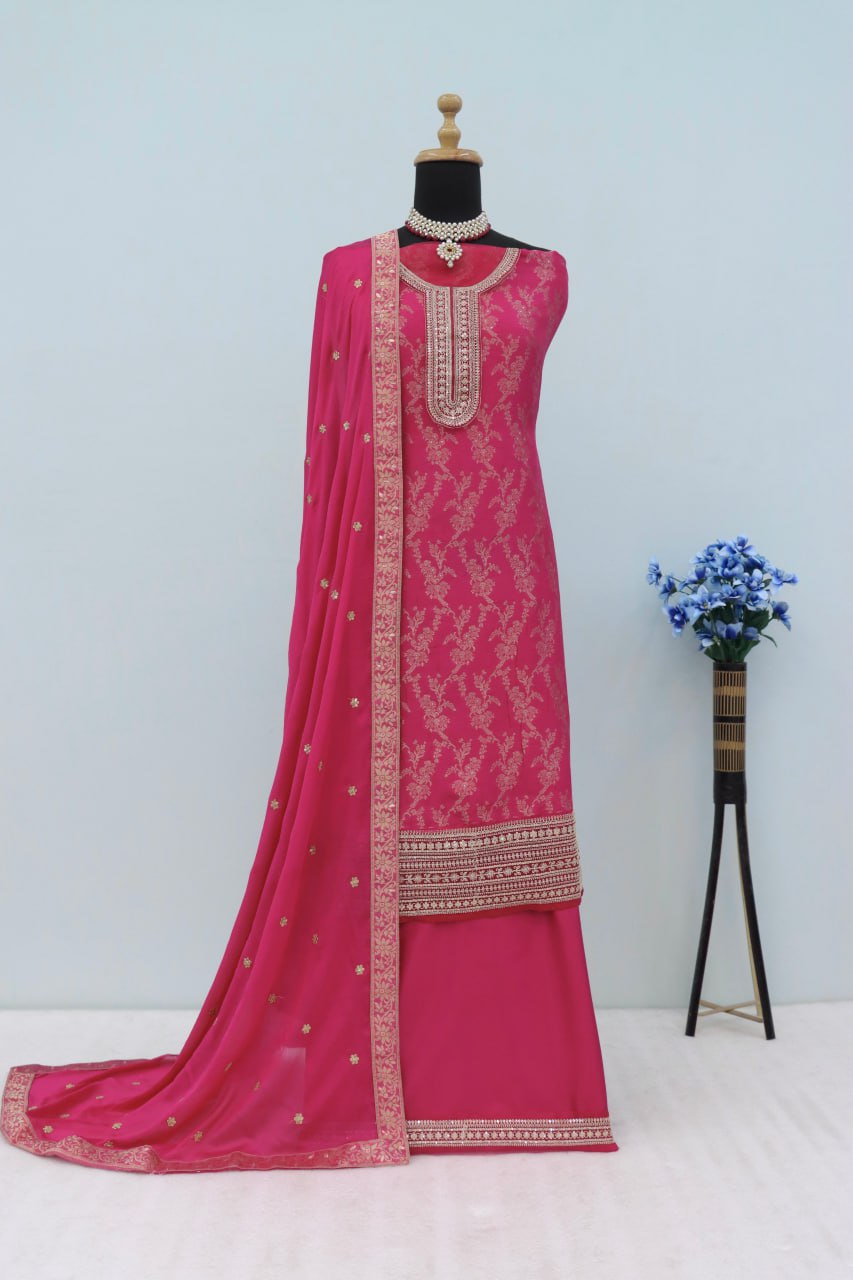 Rani Pink Dola Silk Thread Sequence Embroidered Semi-Stitched Salwar Suit