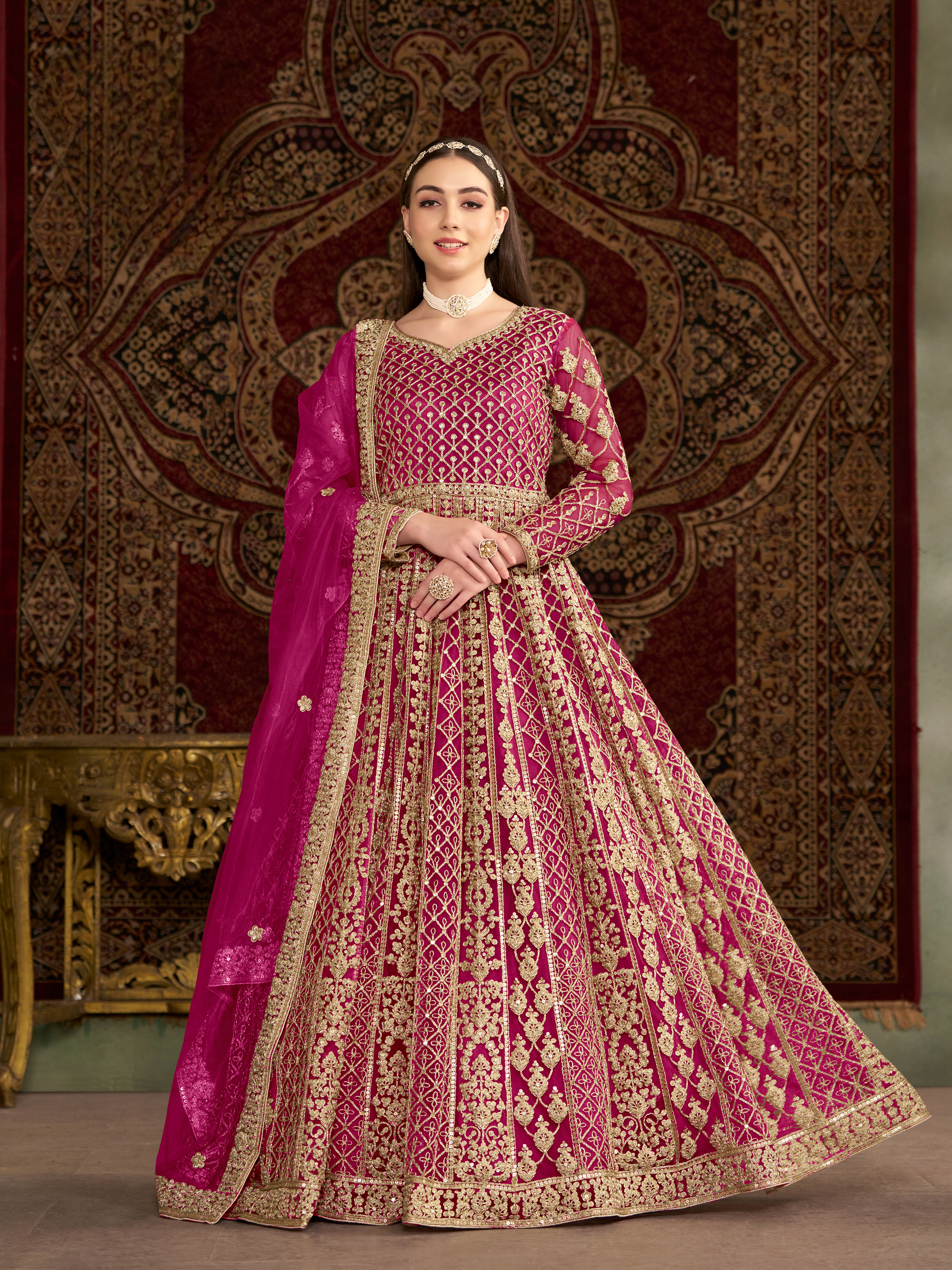 Rani Pink Embroidered Net Semi Stitched Anarkali Suit