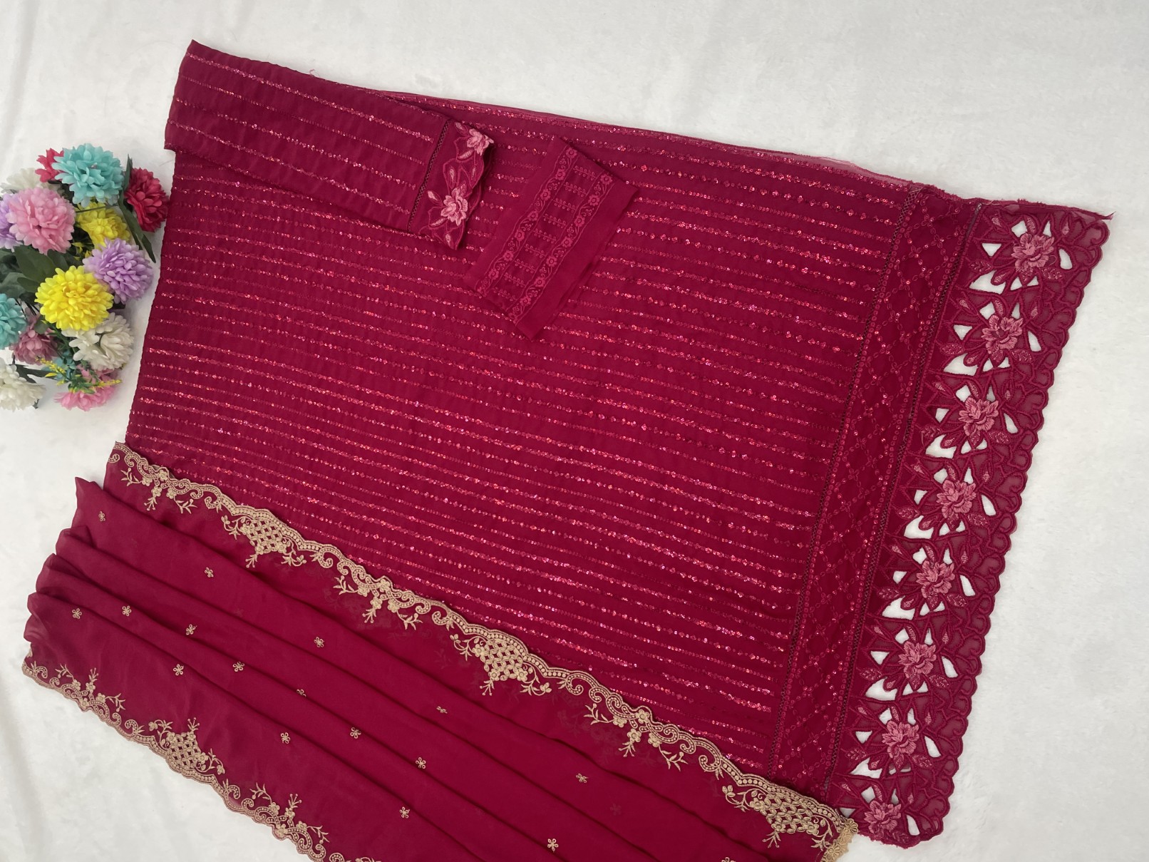 Red Georgette Semi Stitched Suit with Embroidered Sequence Work