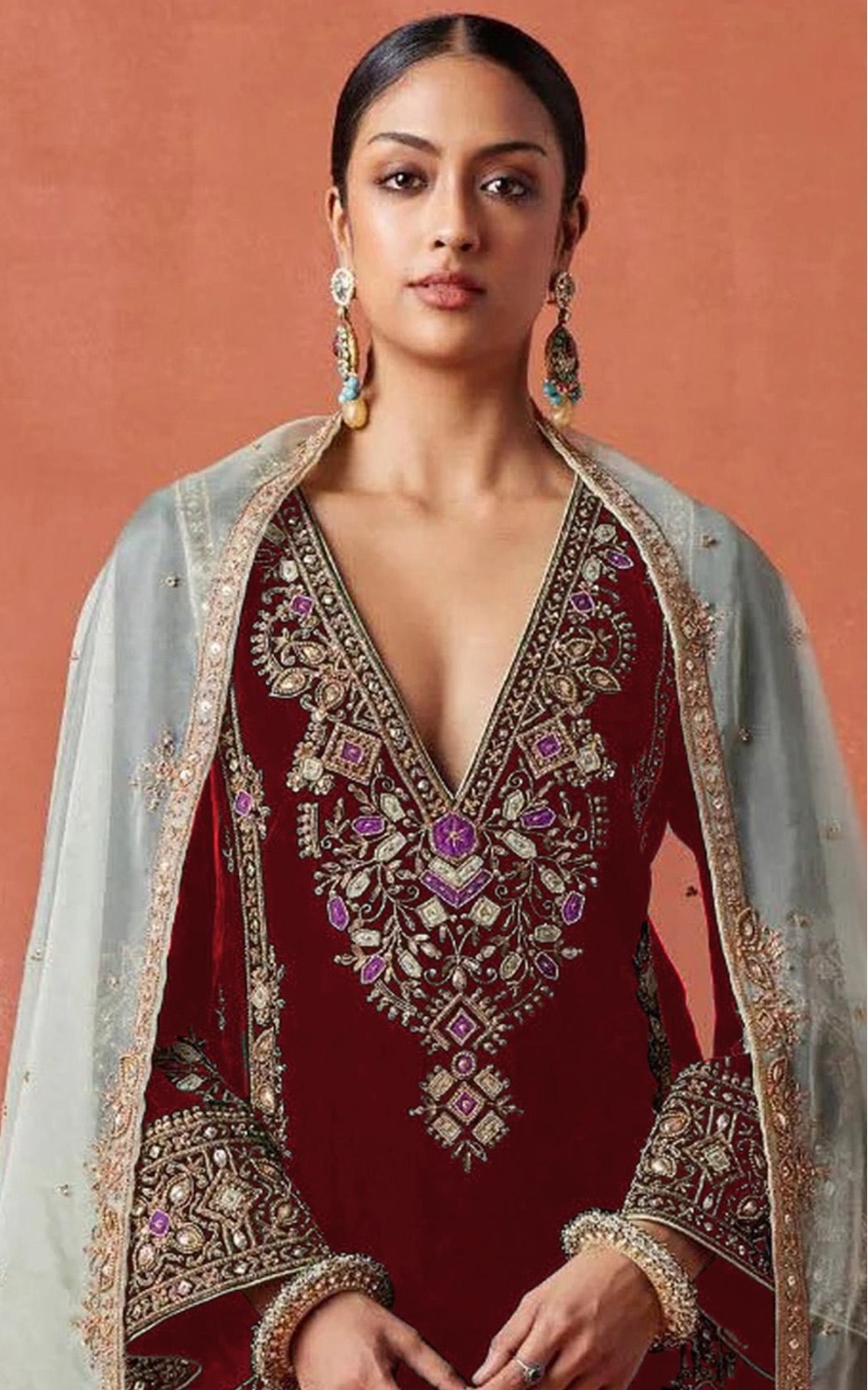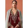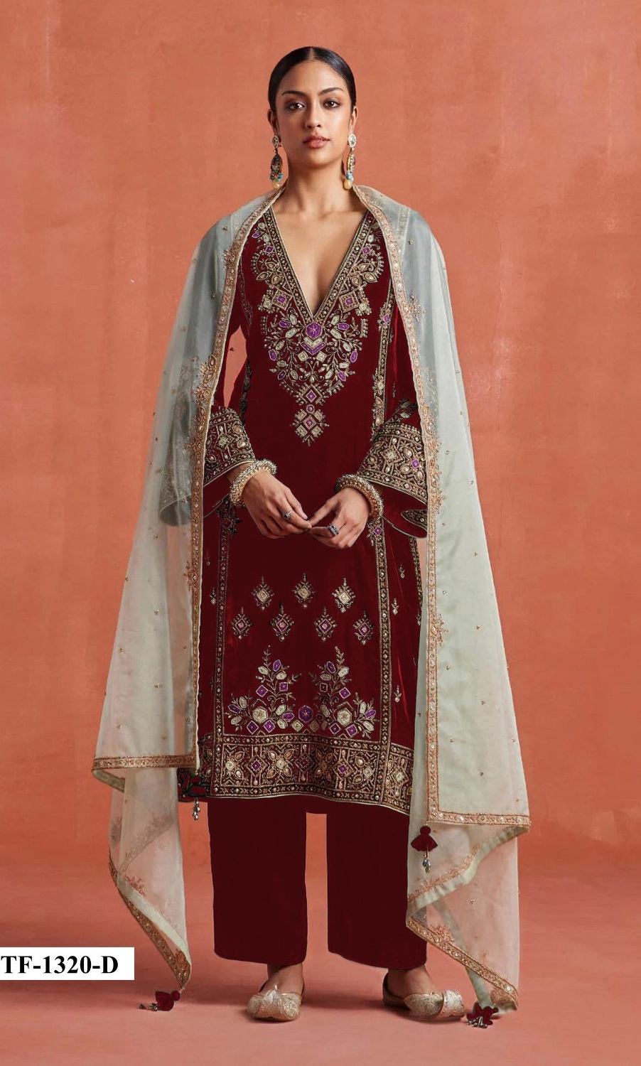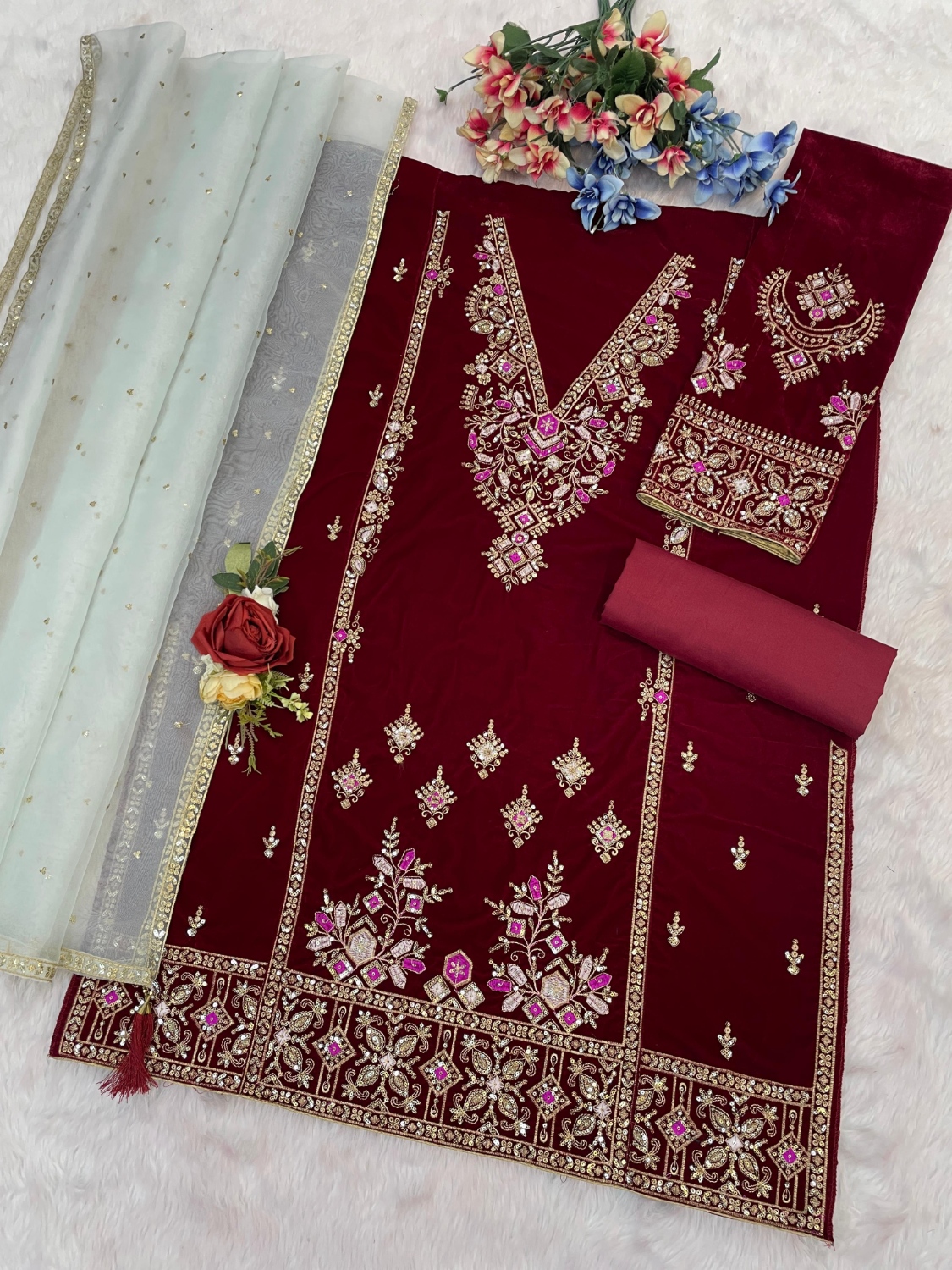 Red Heavy Velvet Semi Stitched Suit With Embroidery Work