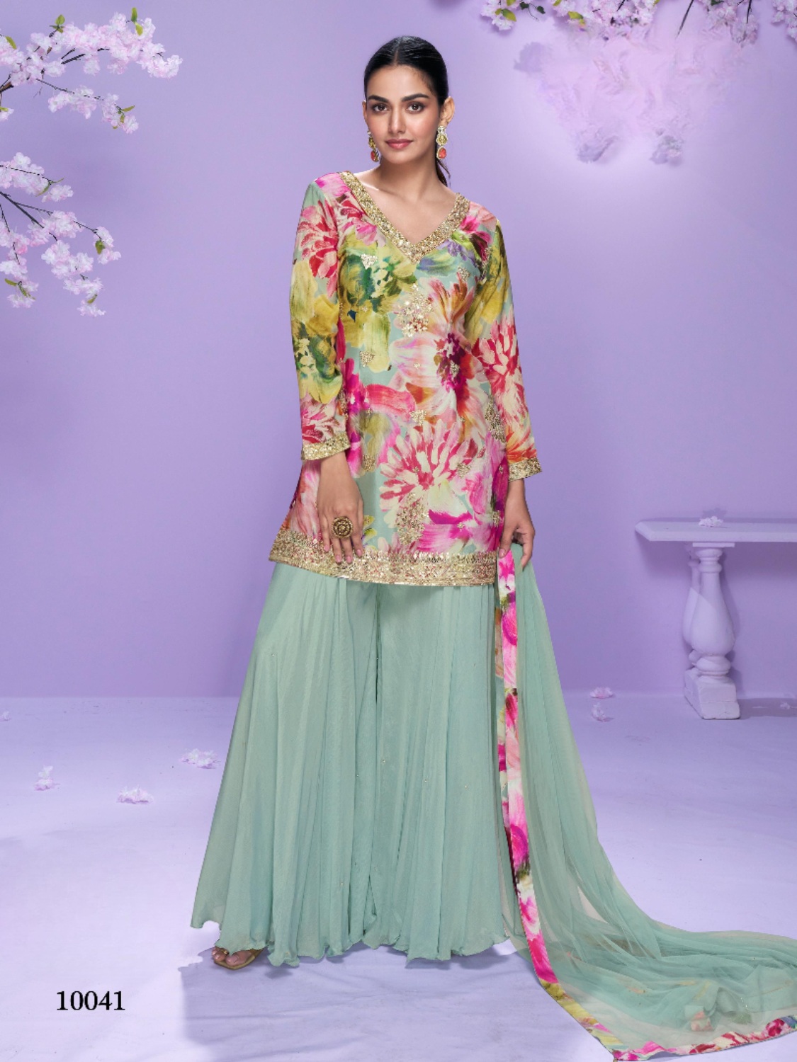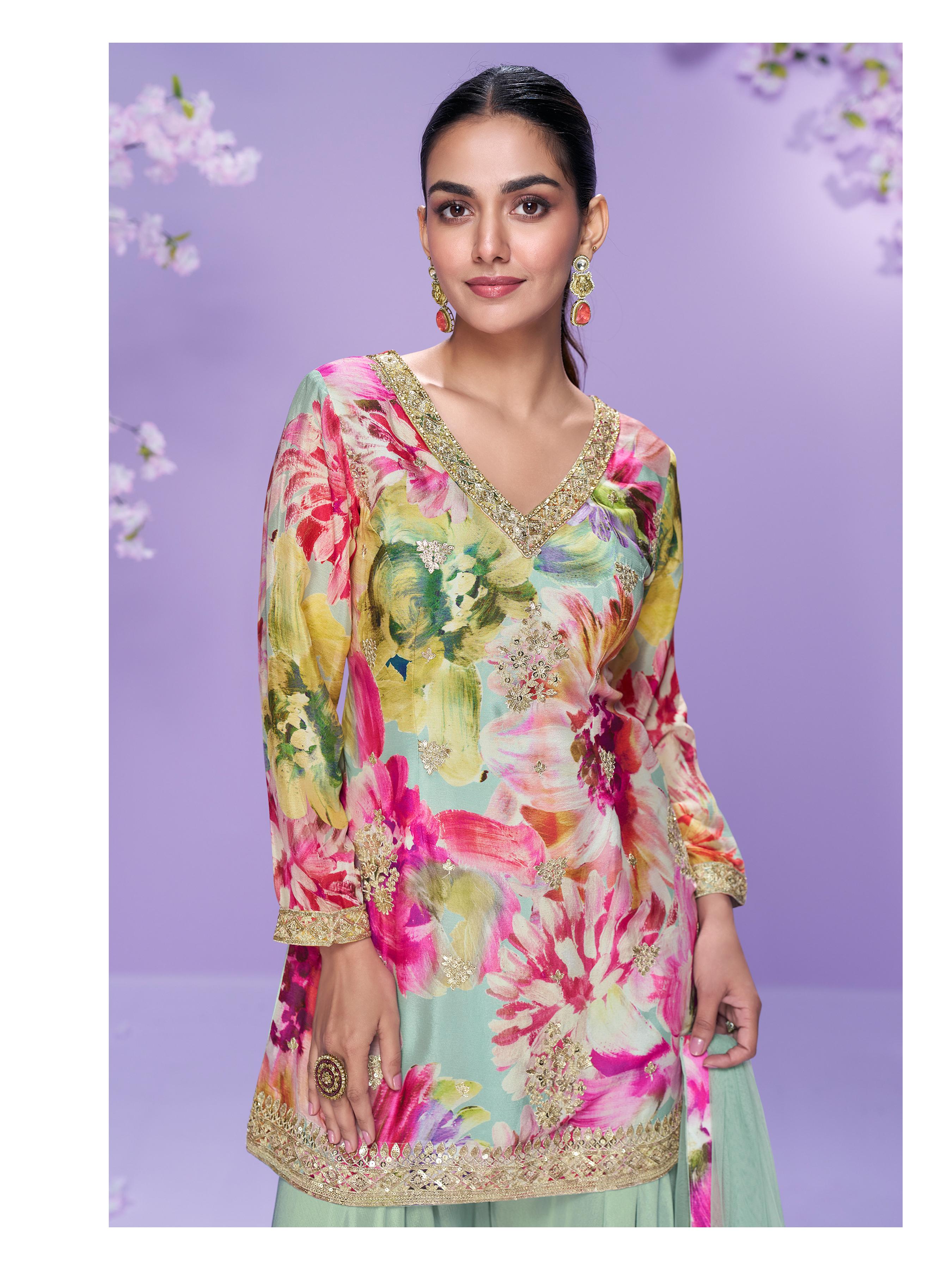 Sea Green Chinon Readymade Plazzo Suit with Digital Embroidery Work