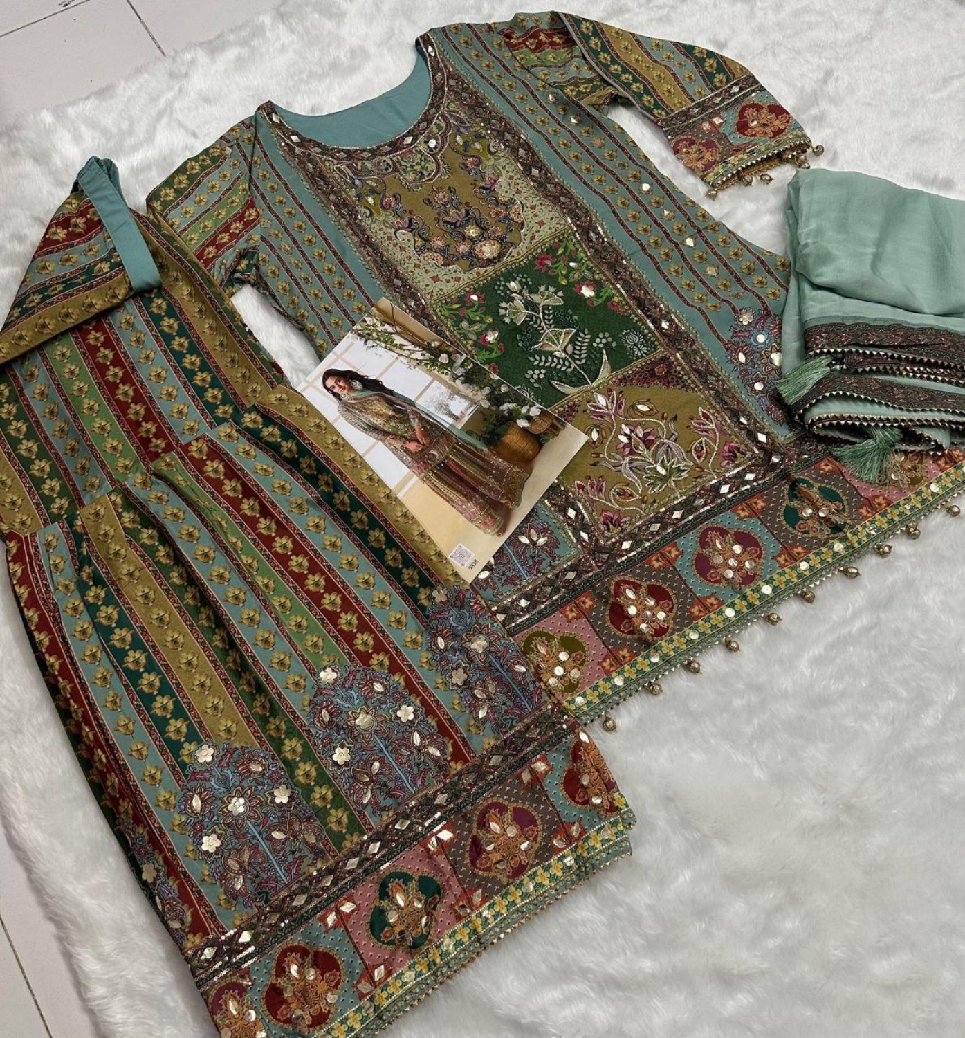 Sea Green Heavy Crepe Silk Ready Made Suit with Multi Digital Printed & Aari Work
