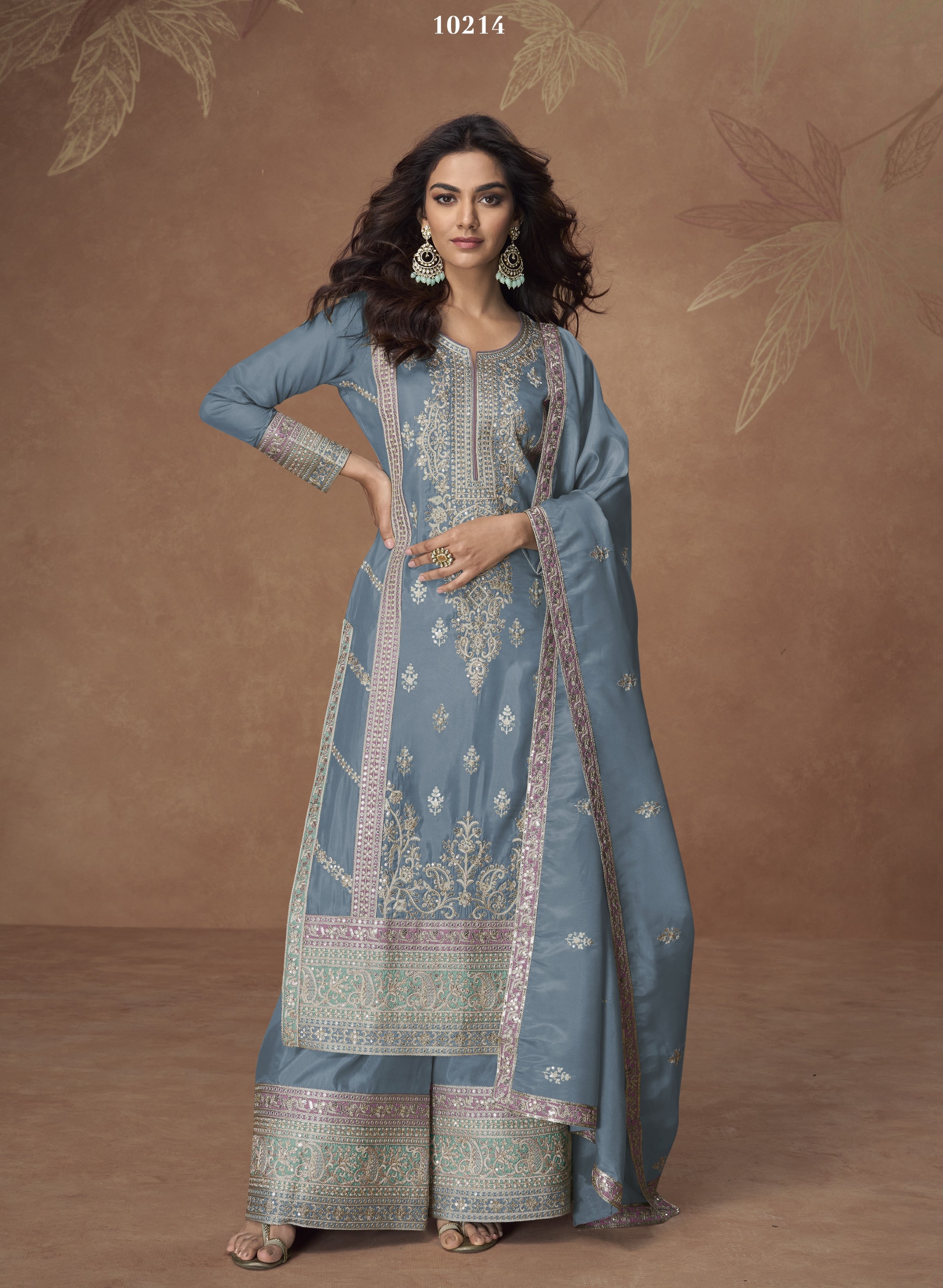 Sky-Blue Chinon Readymade Palazzo Suit with Embroidery Sequence Work