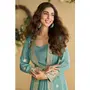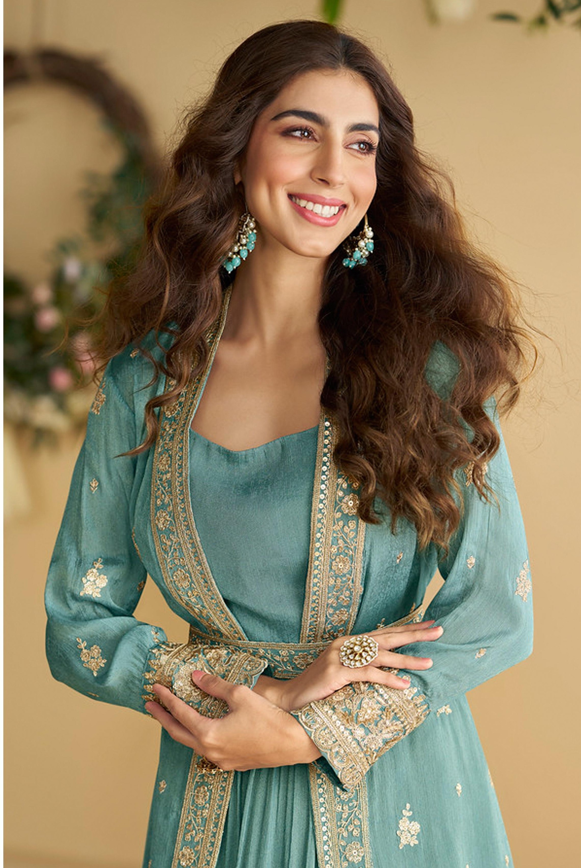 Sky-Blue Chinon Silk Readymade Anarkali Shrug Gown with Belt & Embroidery Work