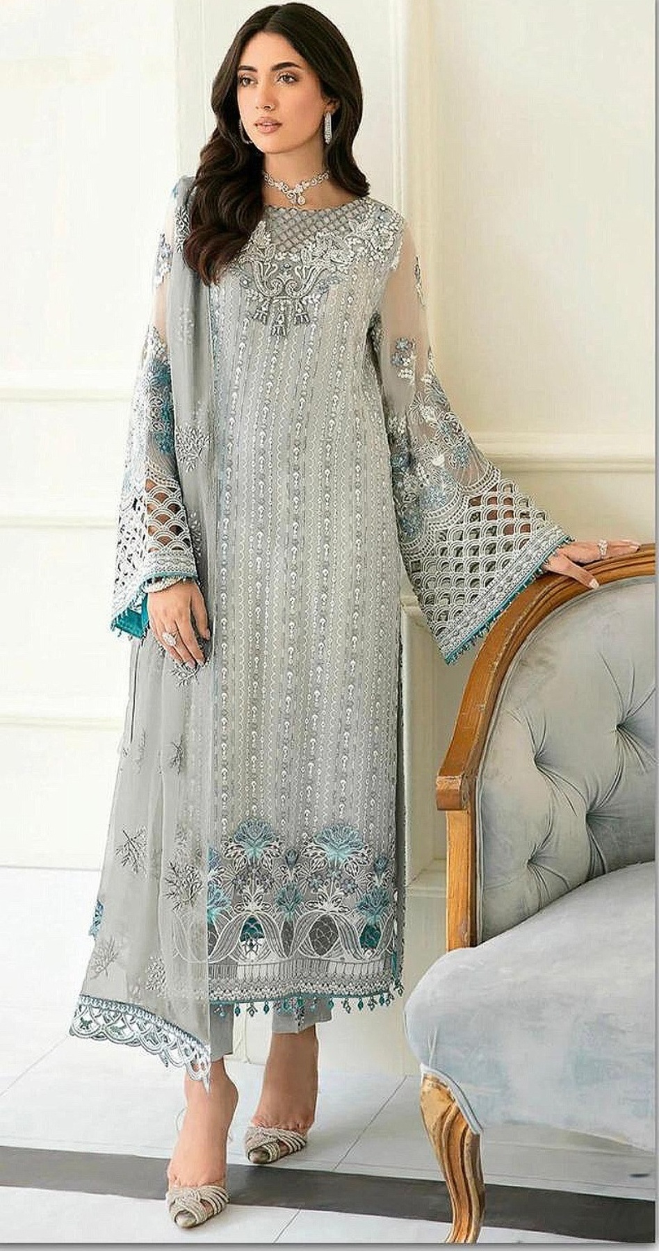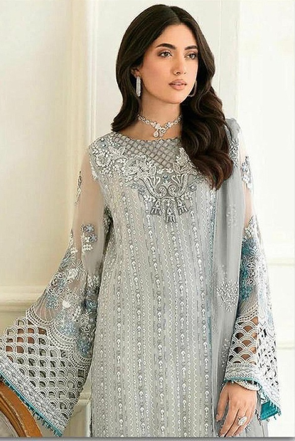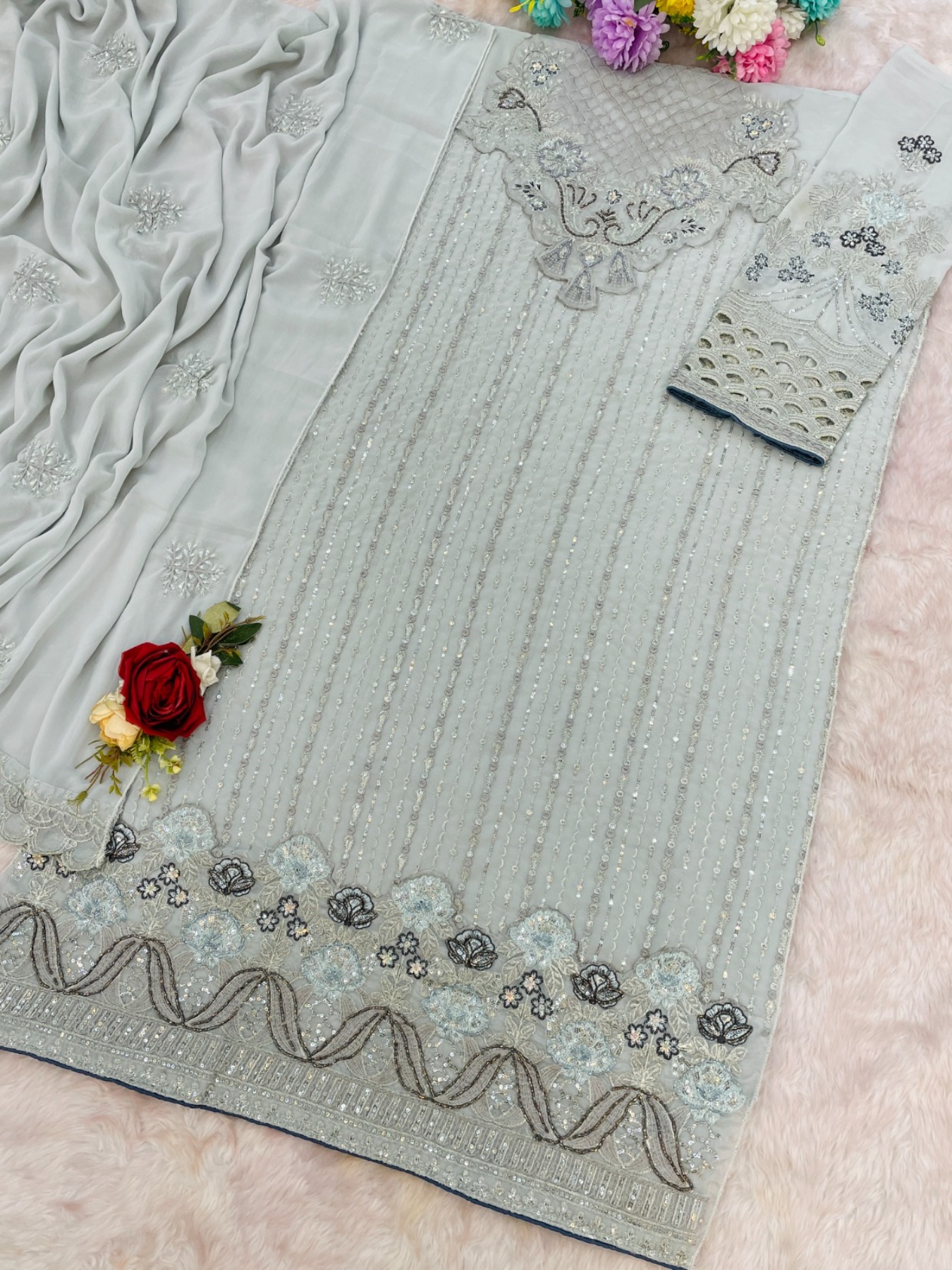 Sky Blue Fox Georgette Semi Stitched Suit with Embroidery Sequence Work & Khatli Work