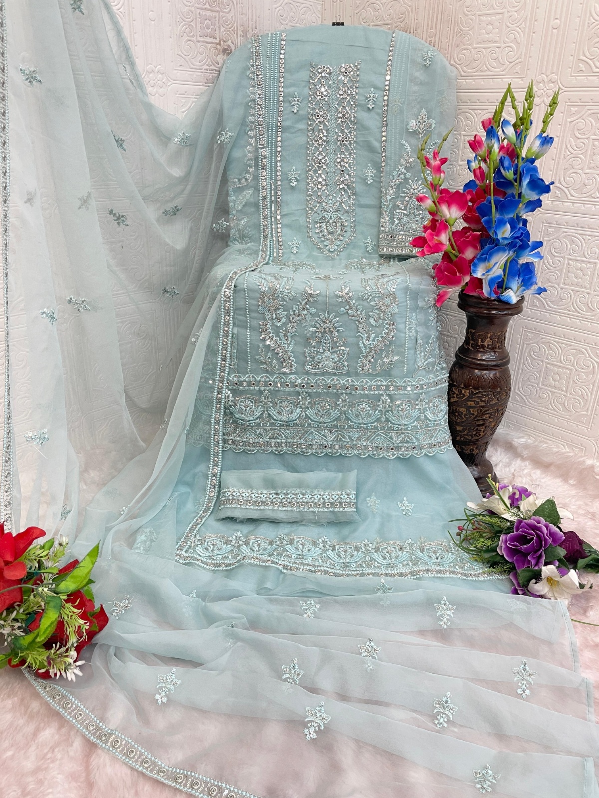 Sky Blue Naylon Organza Semi Stitched Suit With Embroidery & Mirror Work