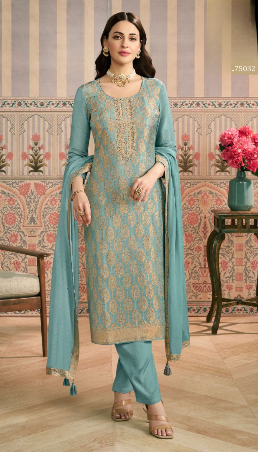 Sky Blue Viscose Lotus Simmer Semi Stitched Suit with Jacquard Work