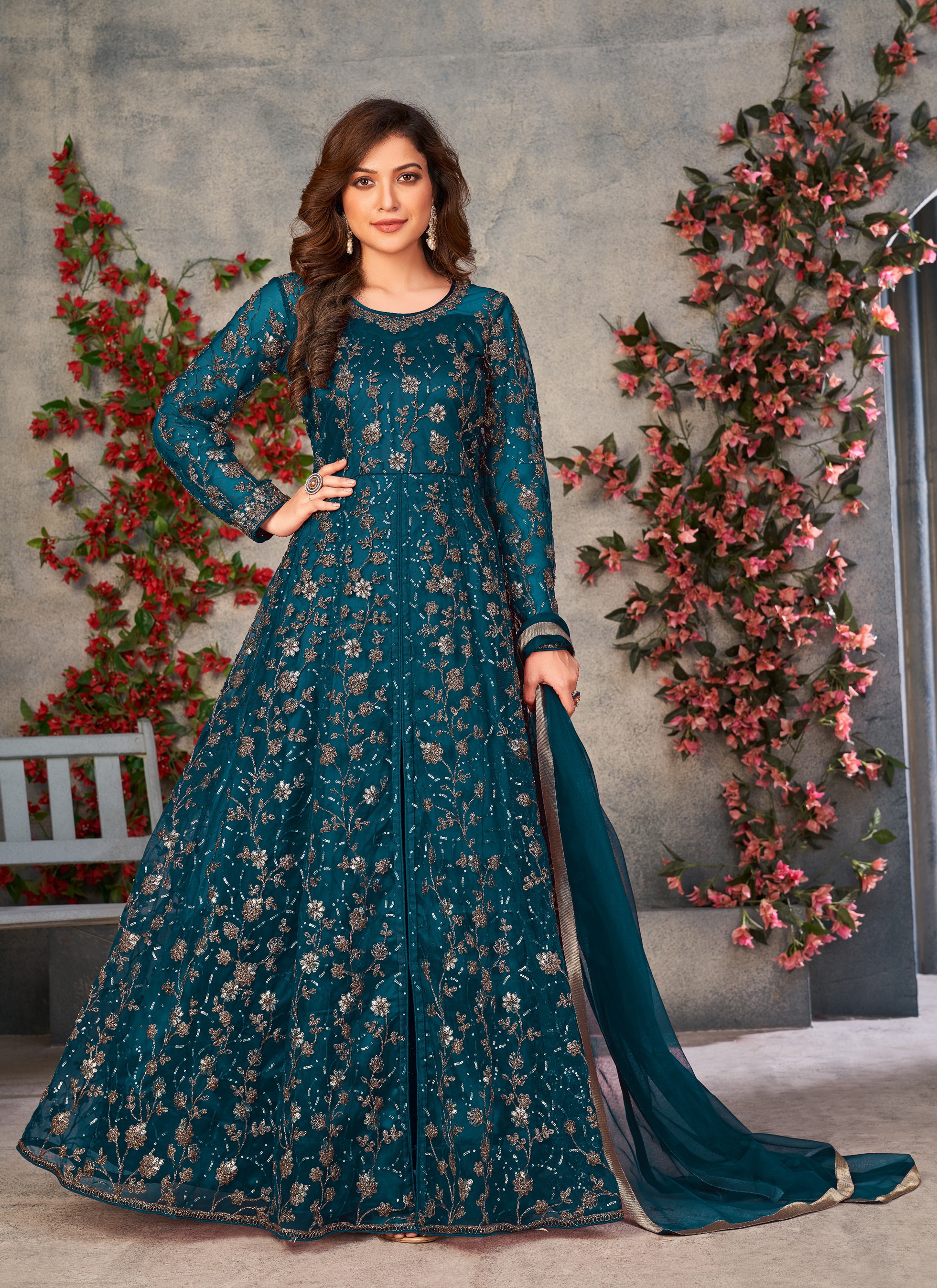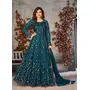 Teal Embroidered Butterfly Net Semi Stitched Anarkali Suit
