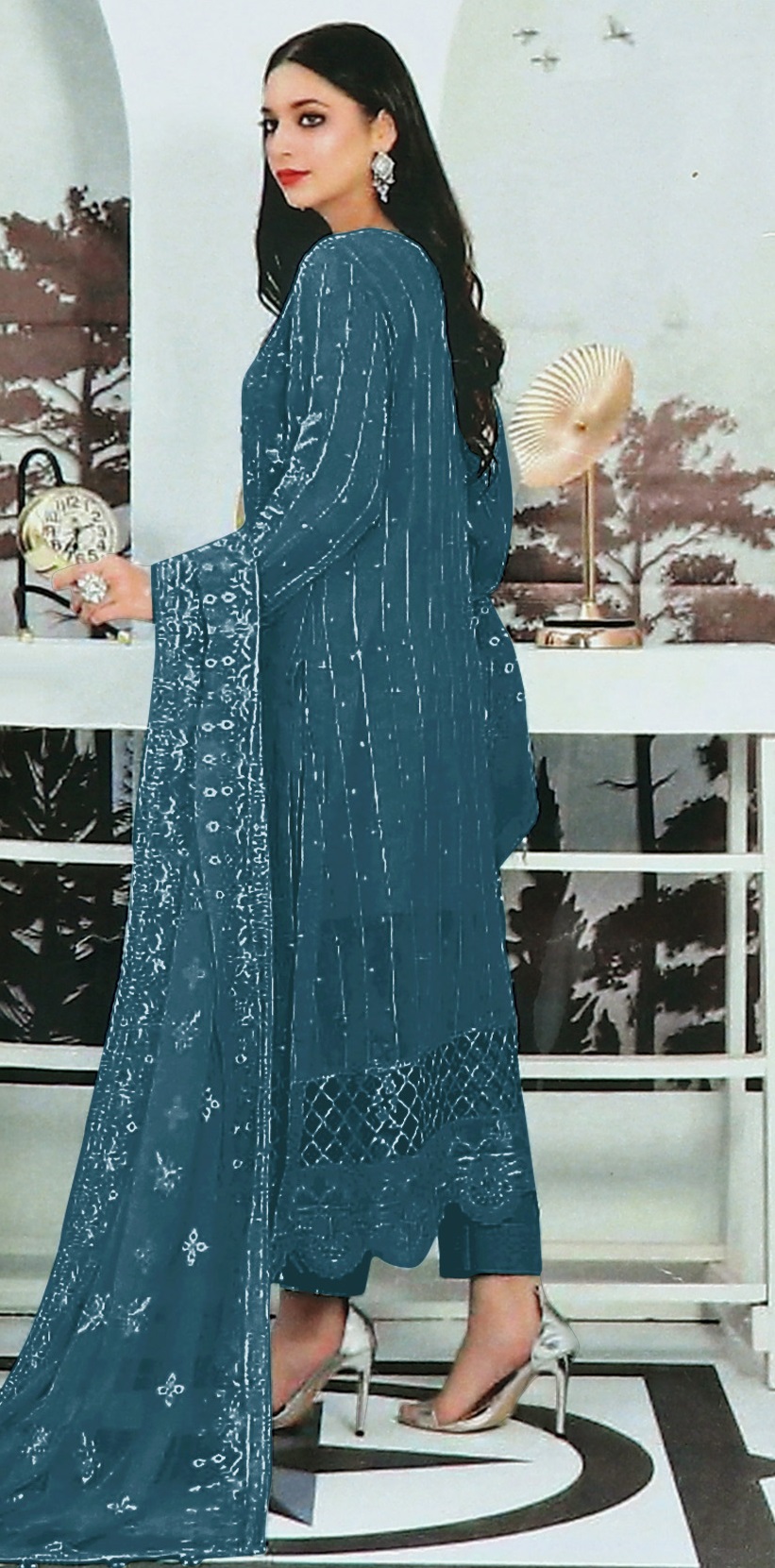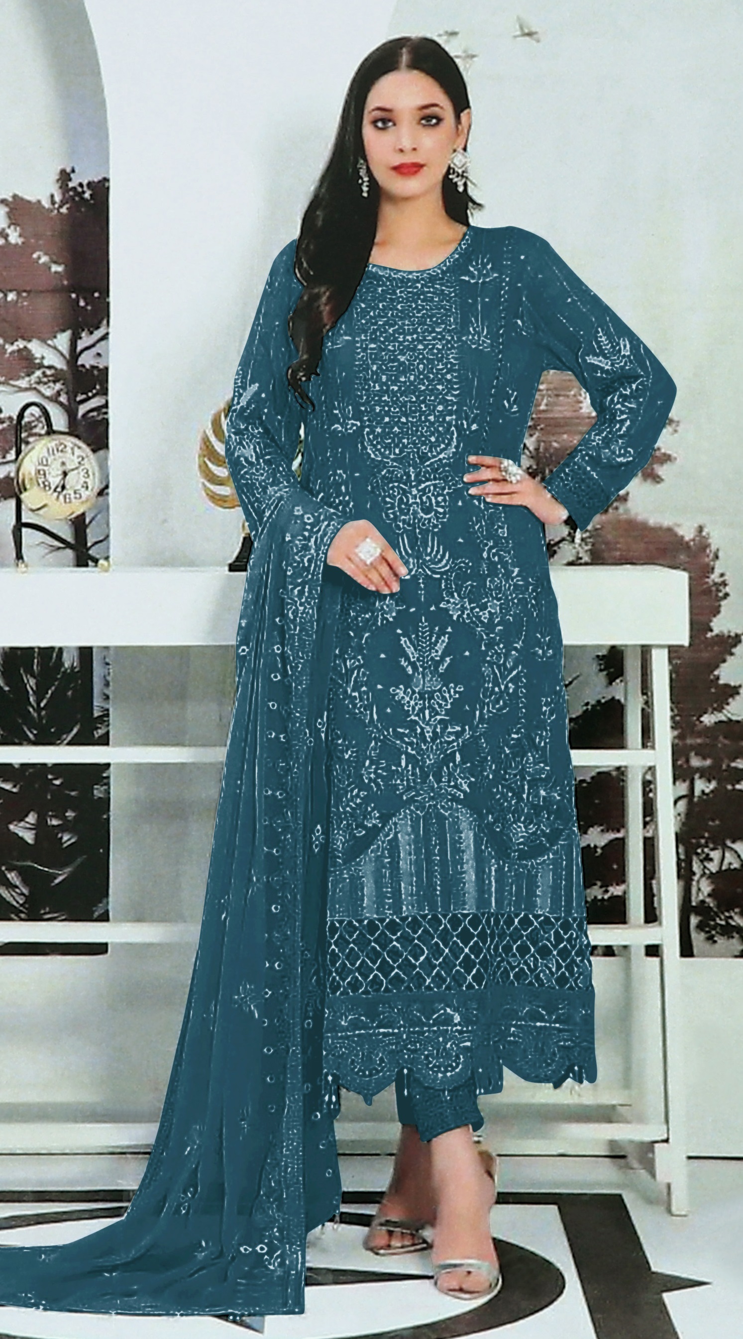Teal Embroidered Faux Georgette Semi Stitched Salwar Suit