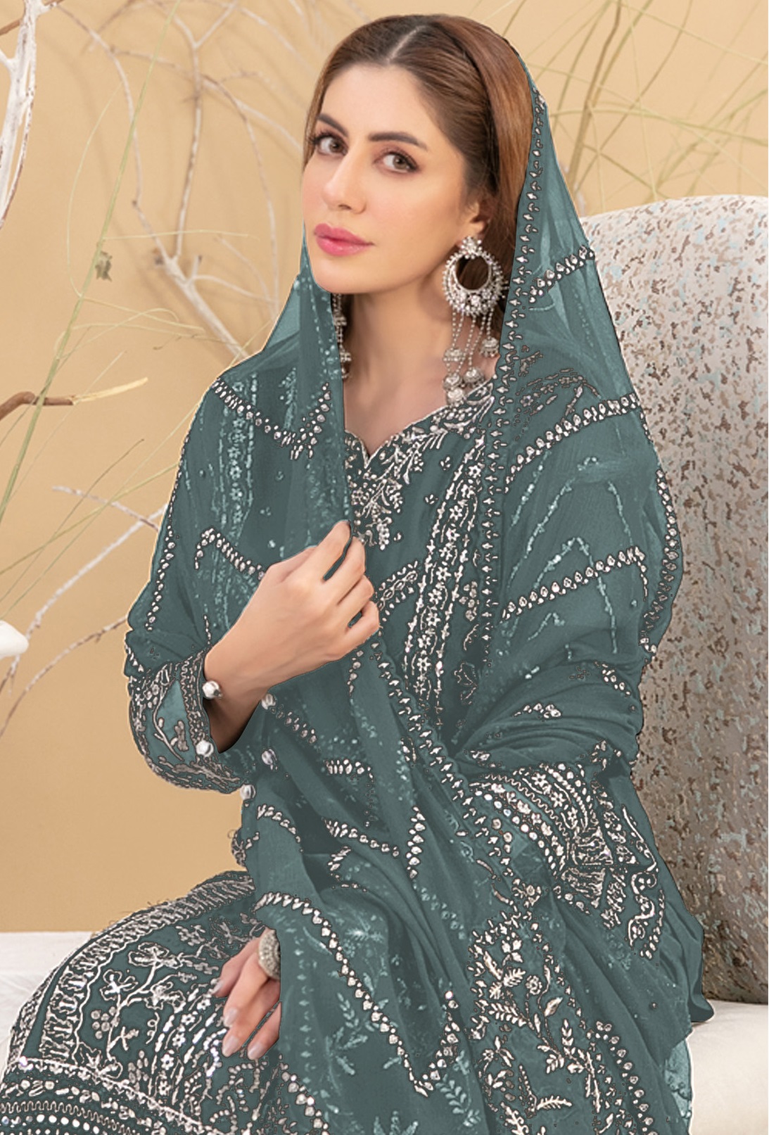 Teal Embroidered Faux Georgette Semi Stitched Salwar Suit