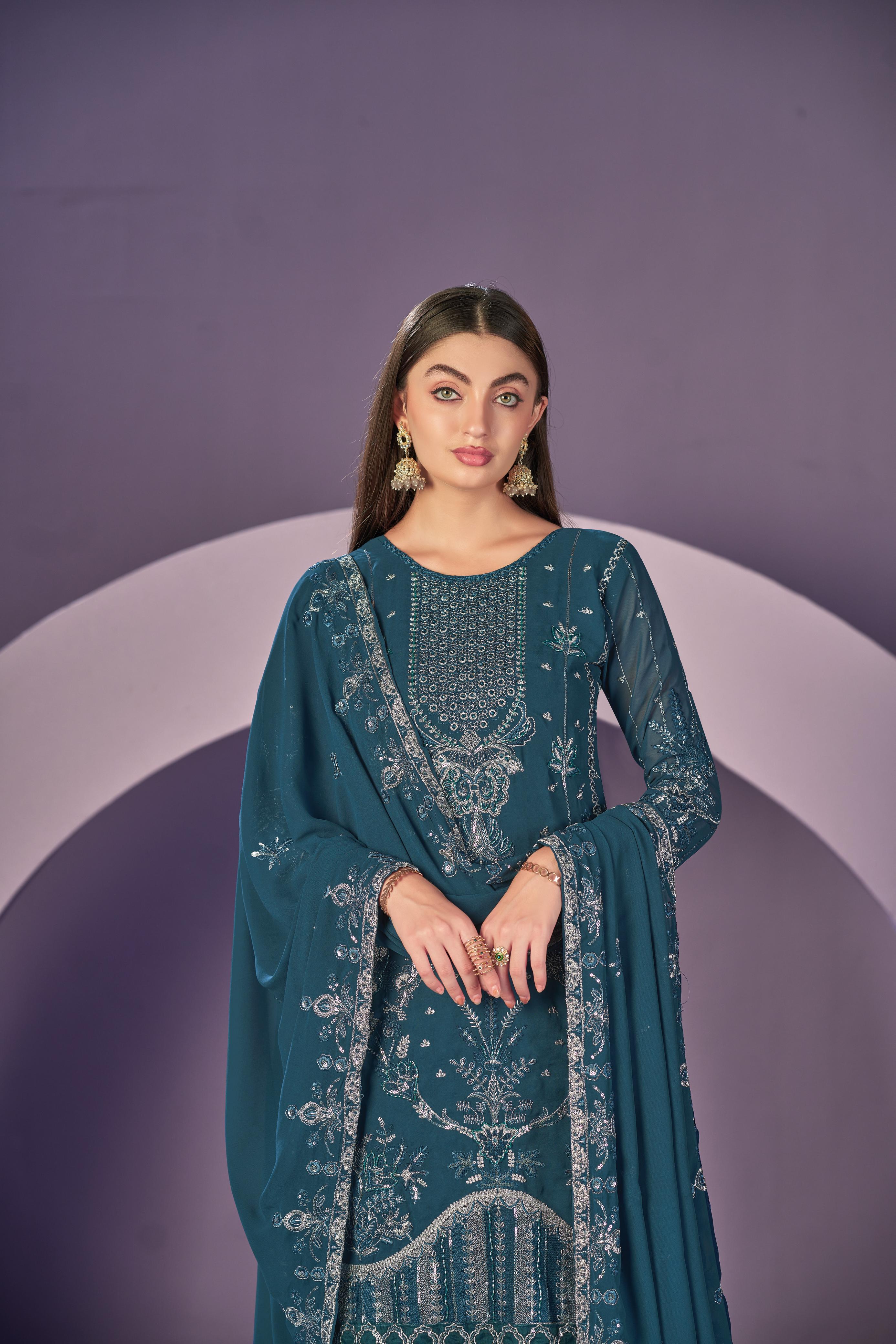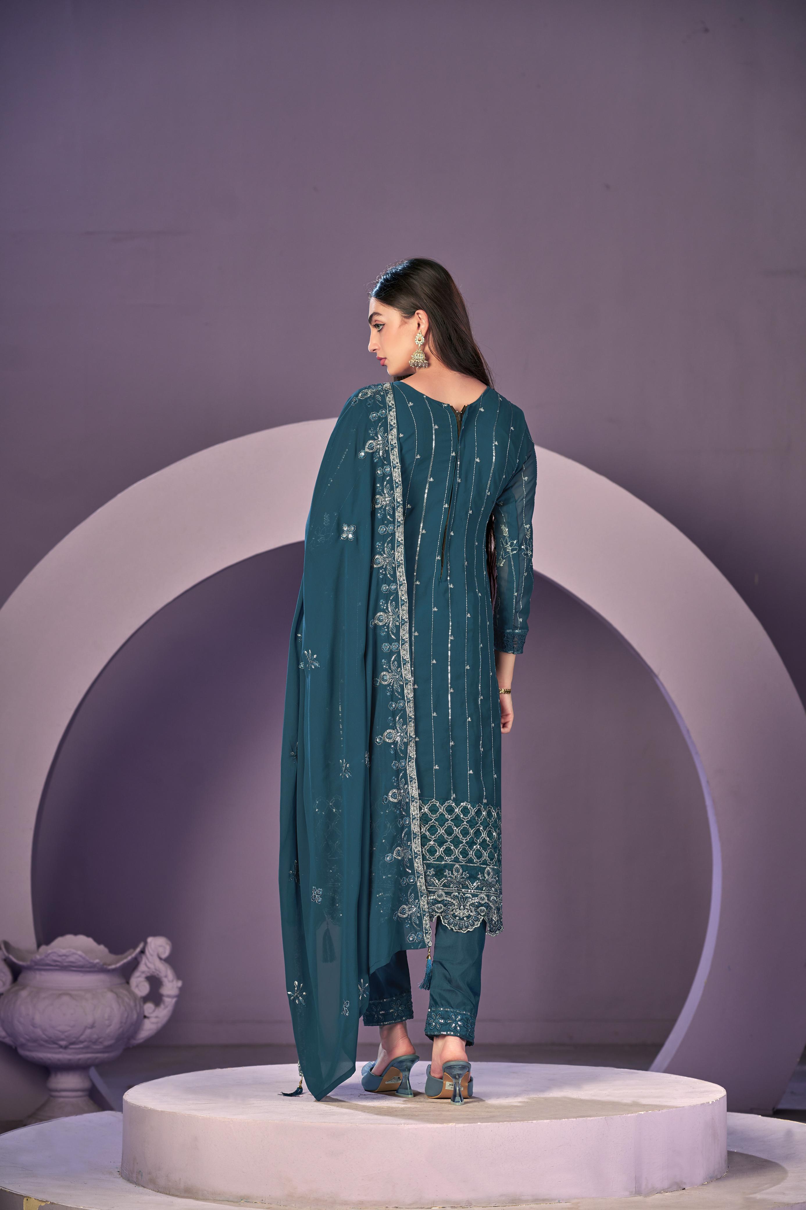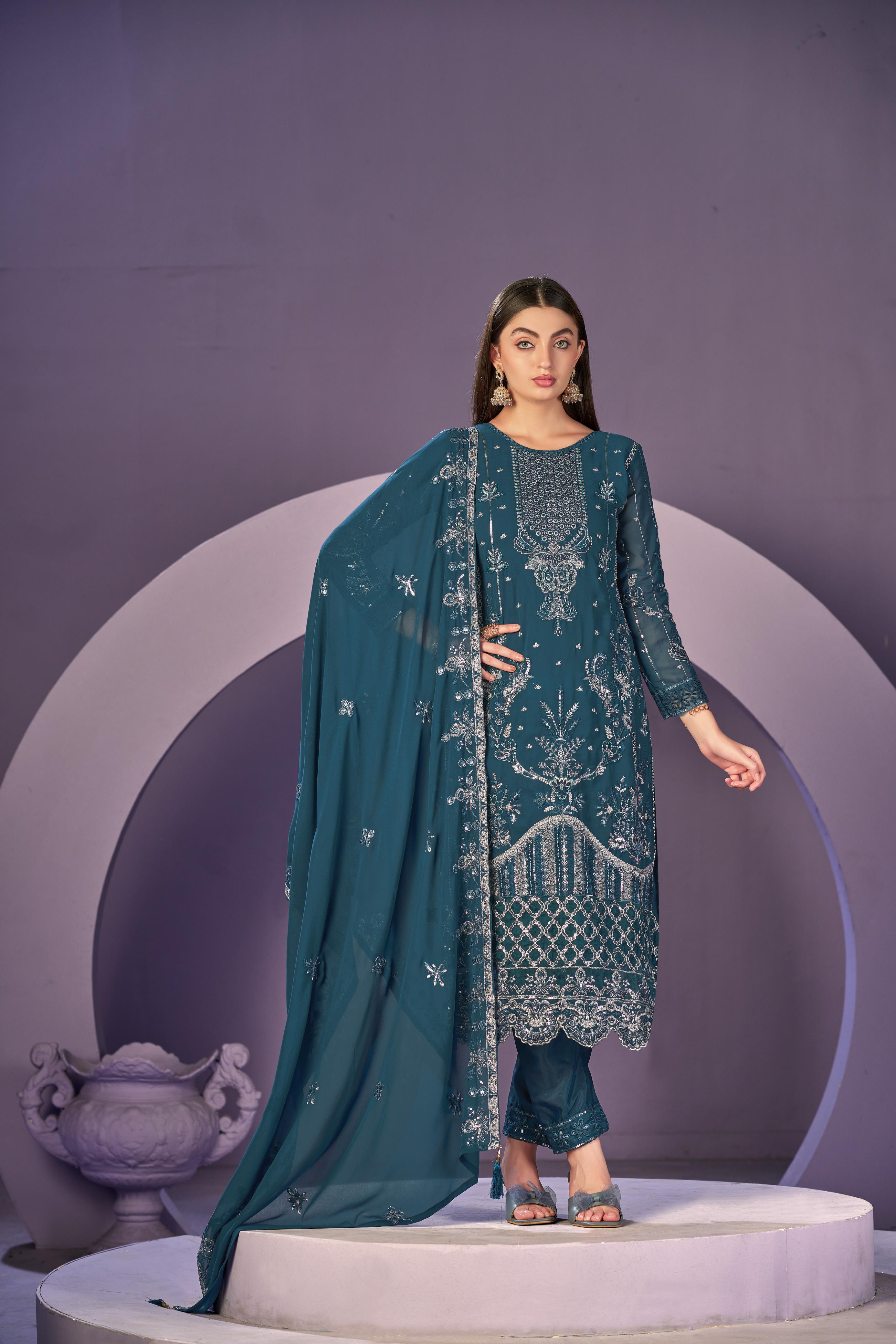 Teal heavy georgette embroidered semi stitched suit with khatli work