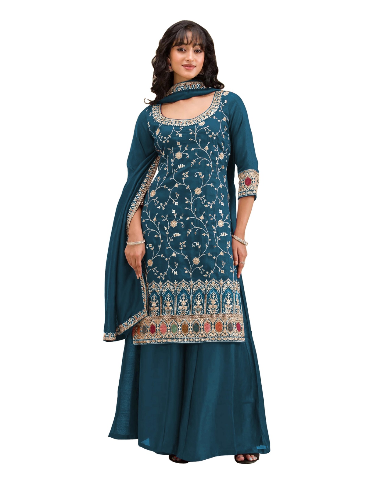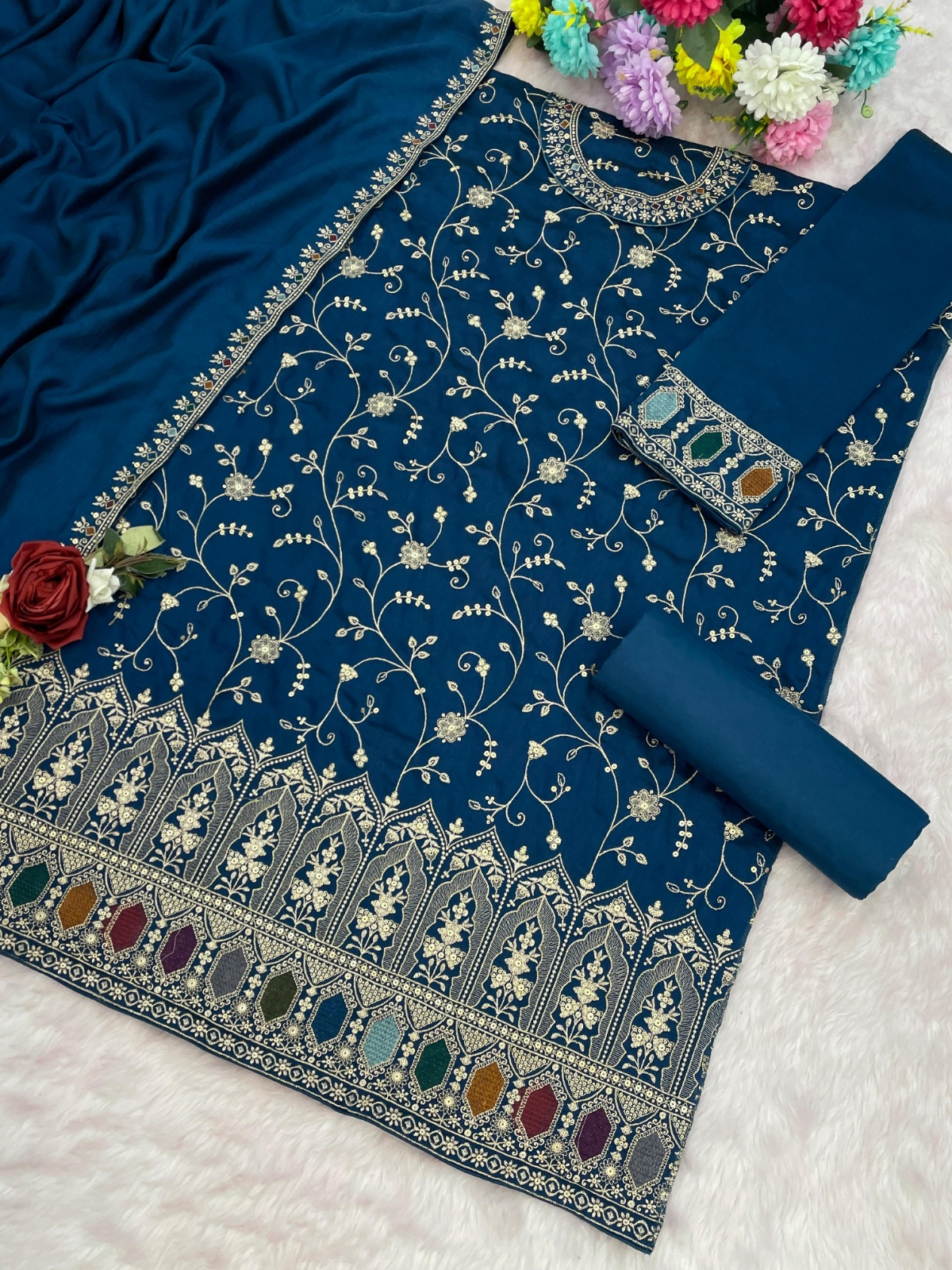 Teal vichitra semi stitched suit with heavy embroidery work