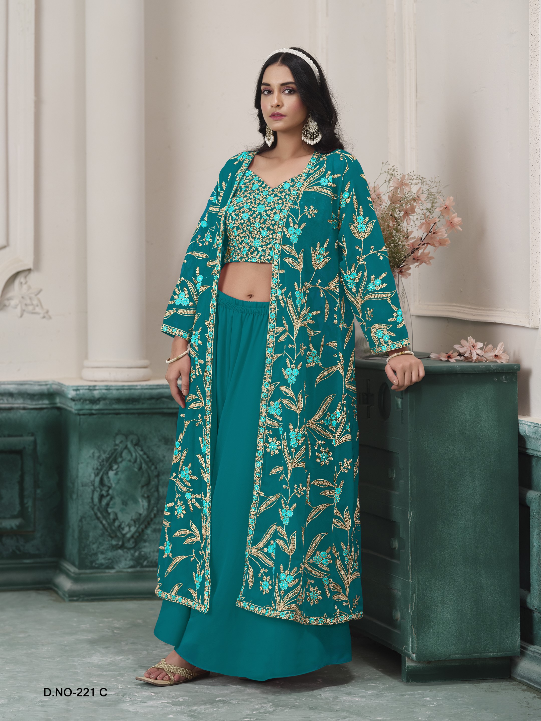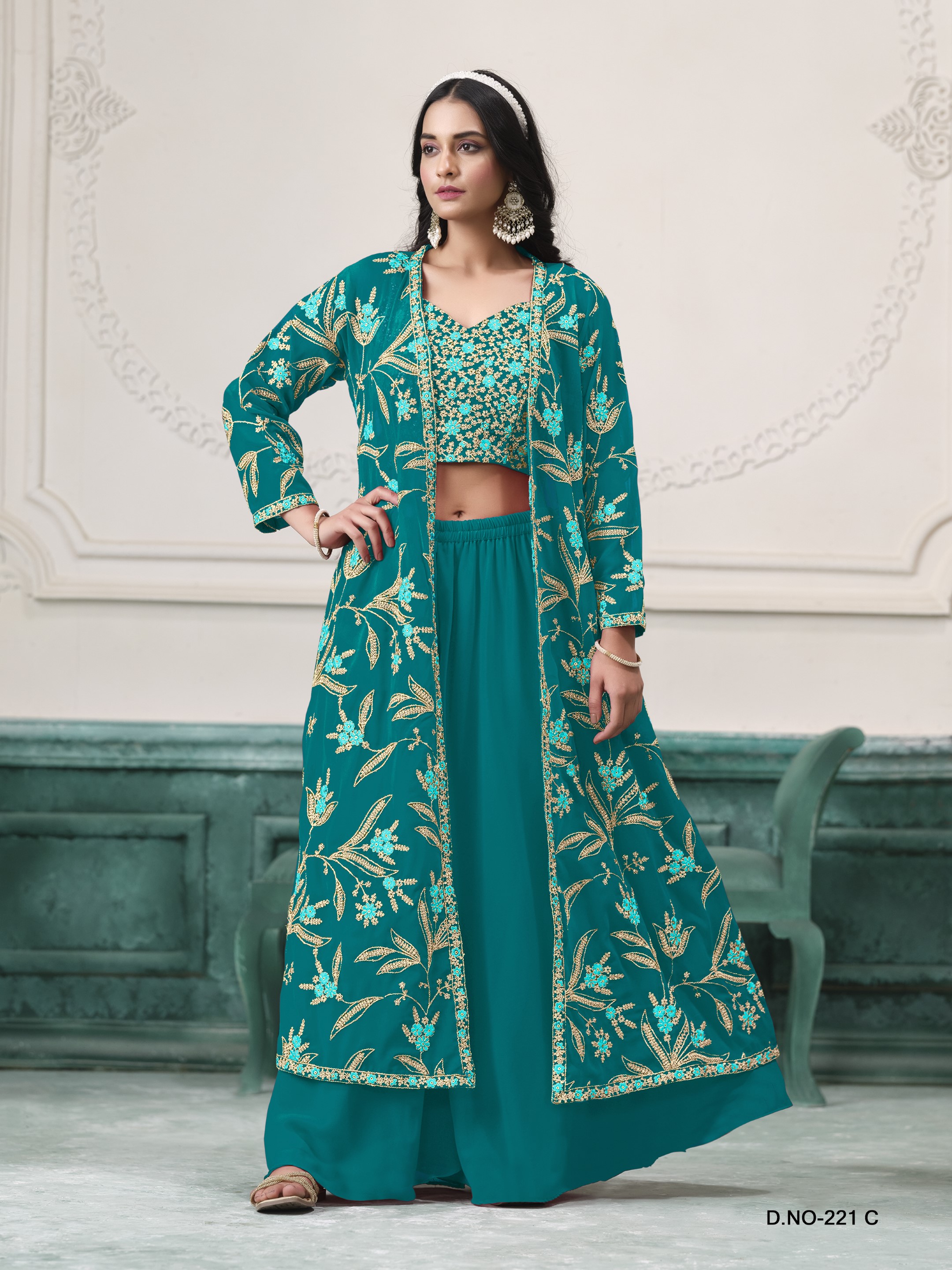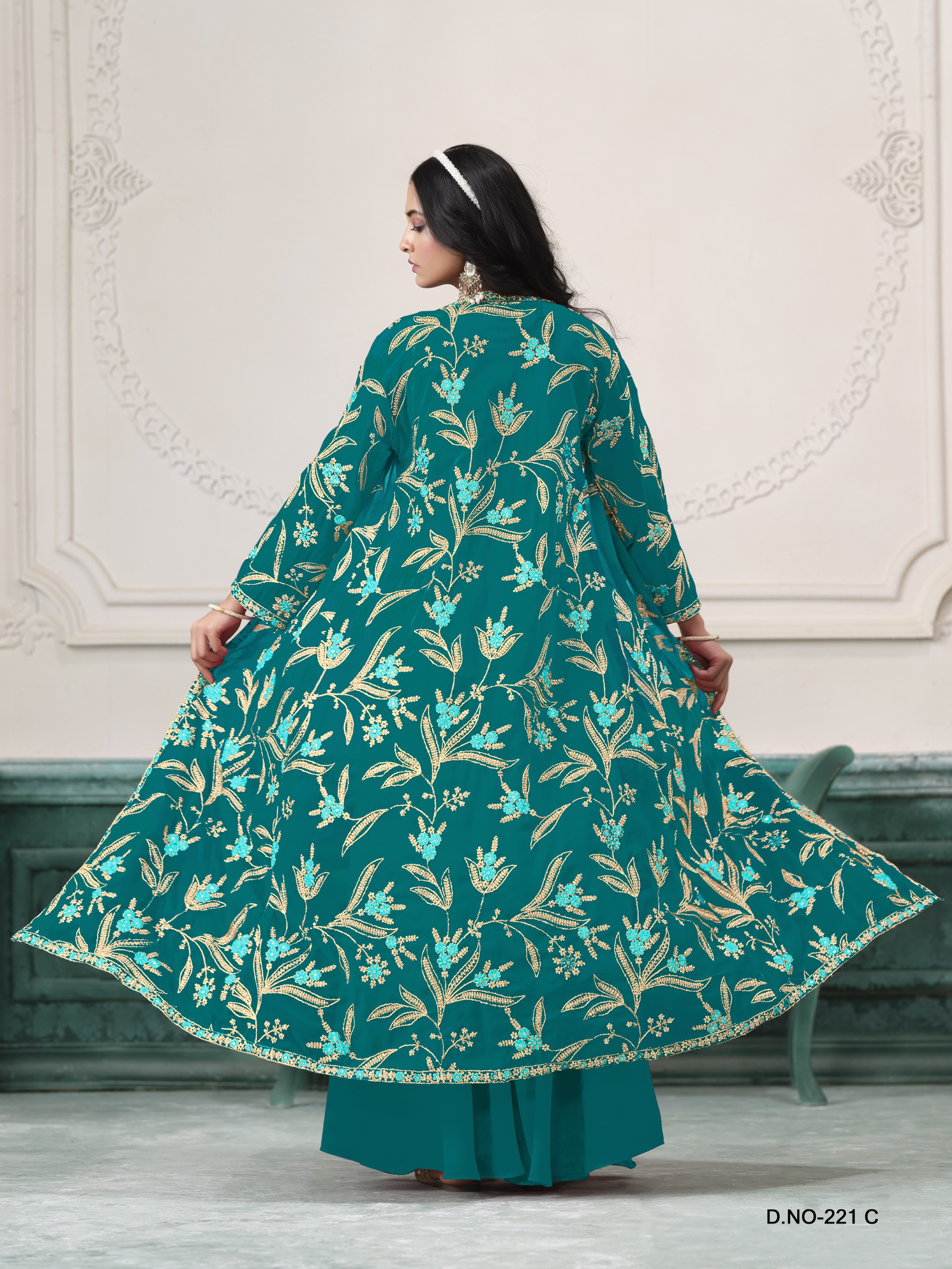 Turquoise Fauk Gerogette Sequence Embroidered Stitched Ethnic Suit (Free Size)