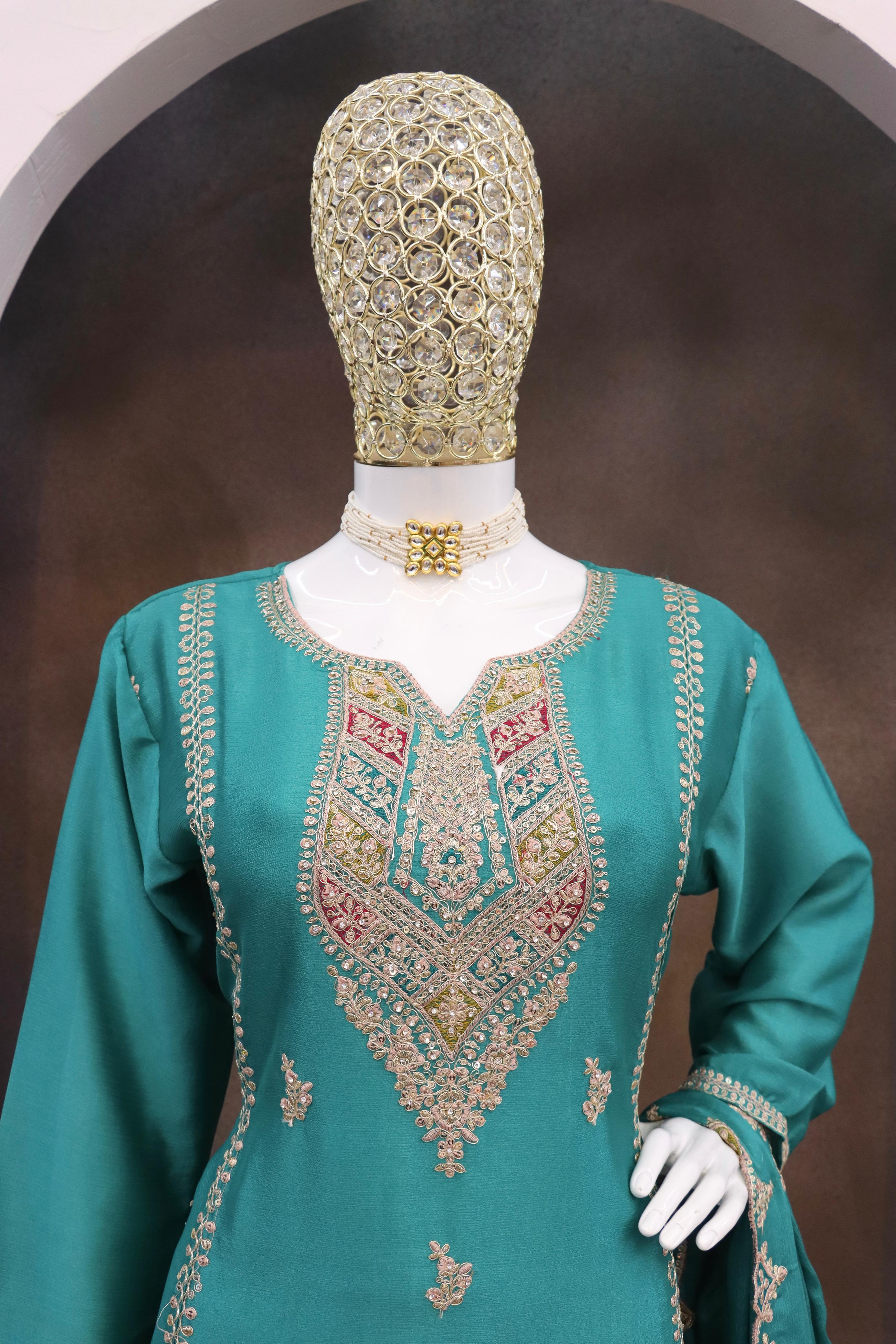 Turquoise Heavy Chinon Reaymade Suit with Embroidery & Sequence Work