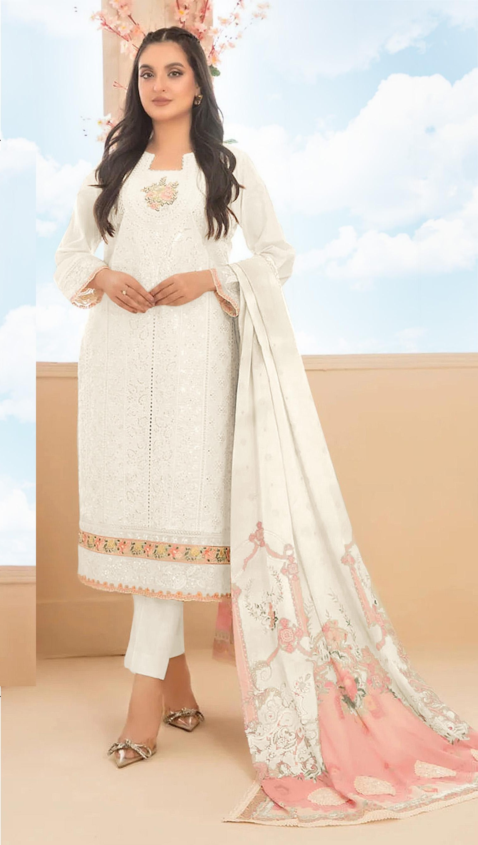 White Cambric Cotton Semi Stitched Suit with Embroidery & Sequence Work