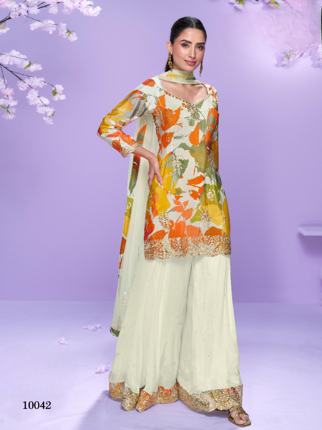 White Chinon Readymade Plazzo Suit with Digital Embroidery Work