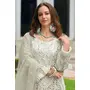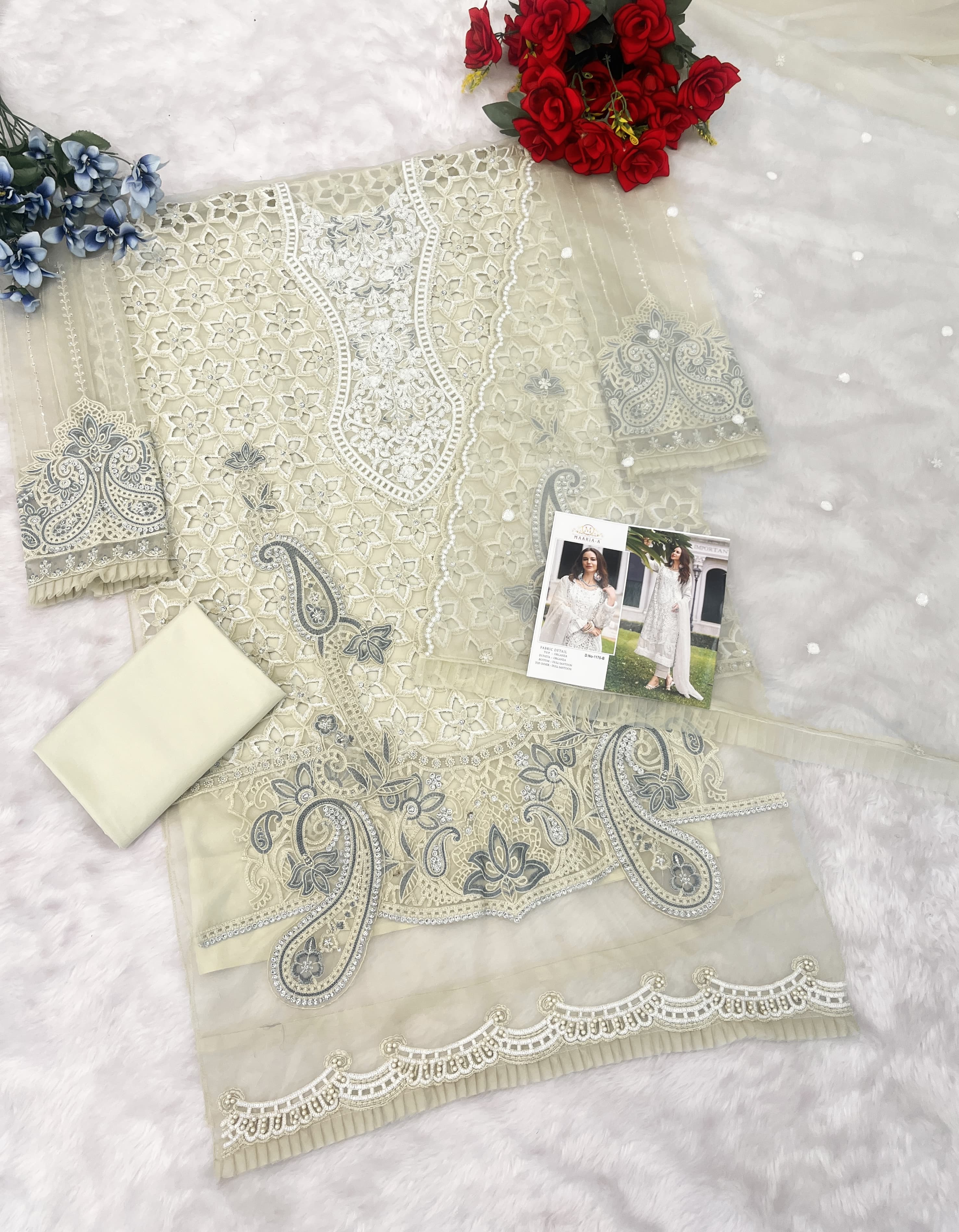 White embroidered sequence cut work heavy organza unstitched suit with moti & Frill