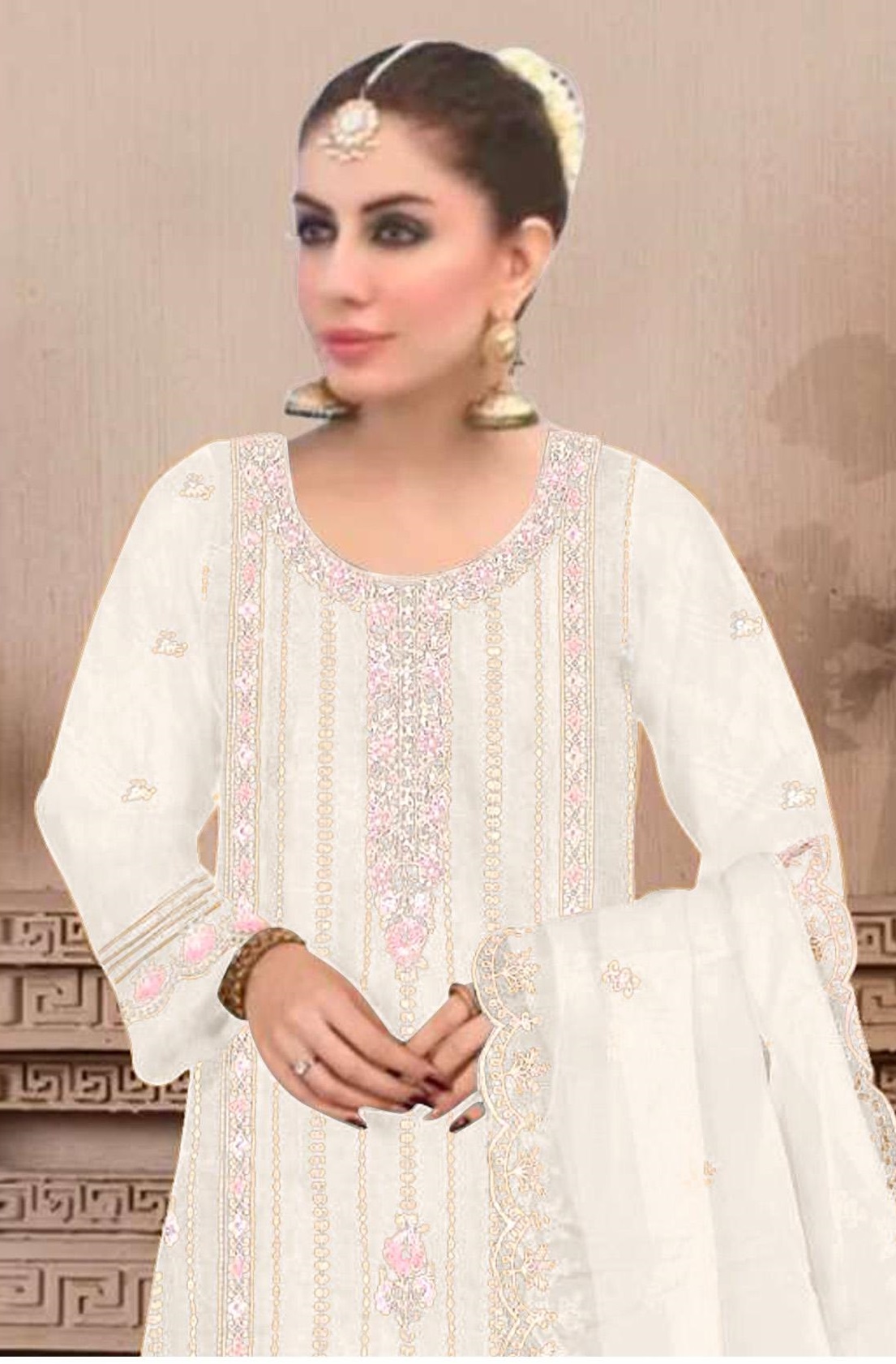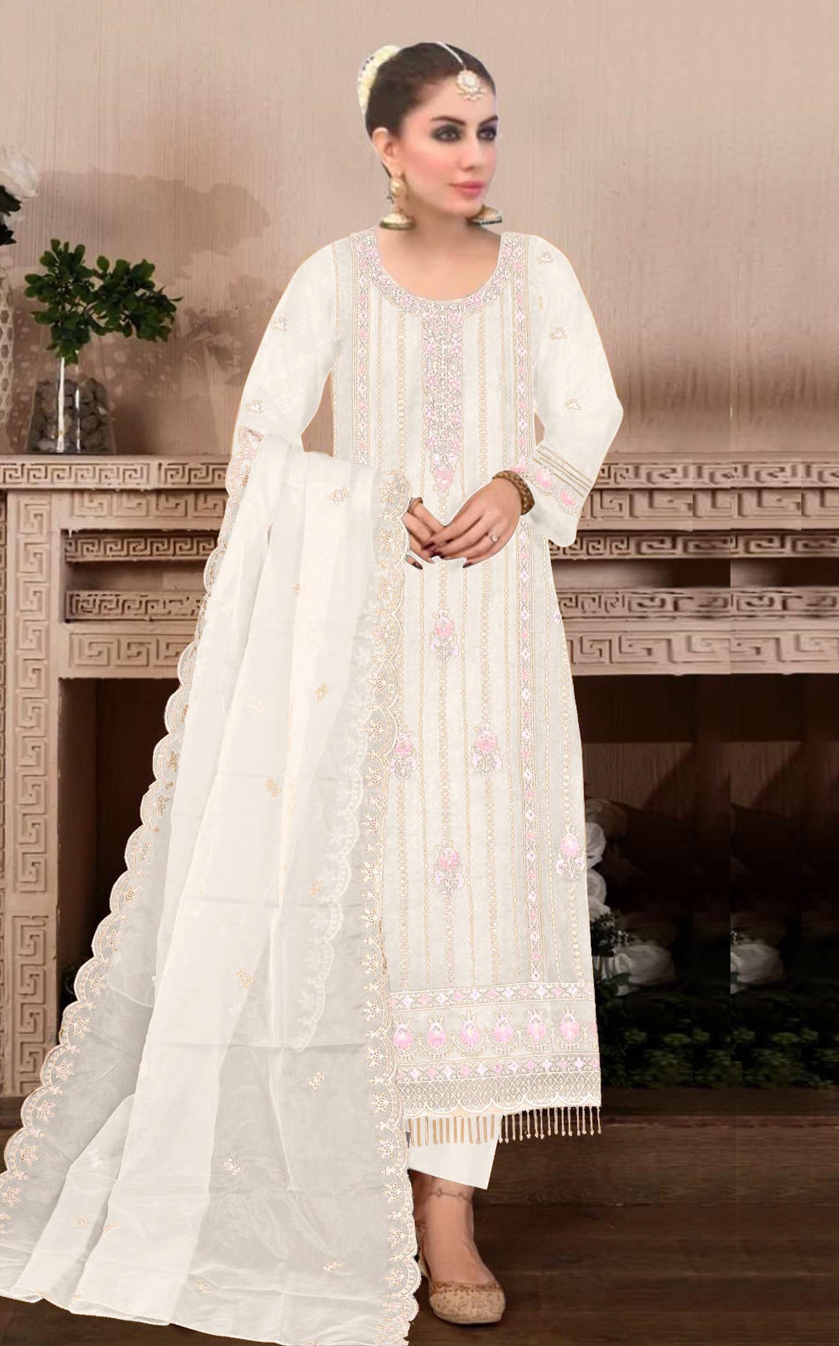 White Embroidered Viscose Chinon Semi Stitched Salwar Suit