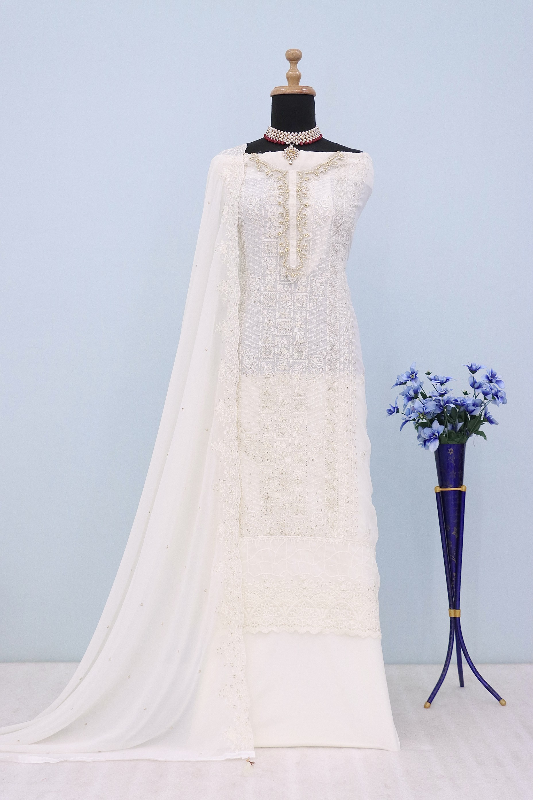 White Georgette Semi Stitched Suit with Sequence & Multi Thread Work