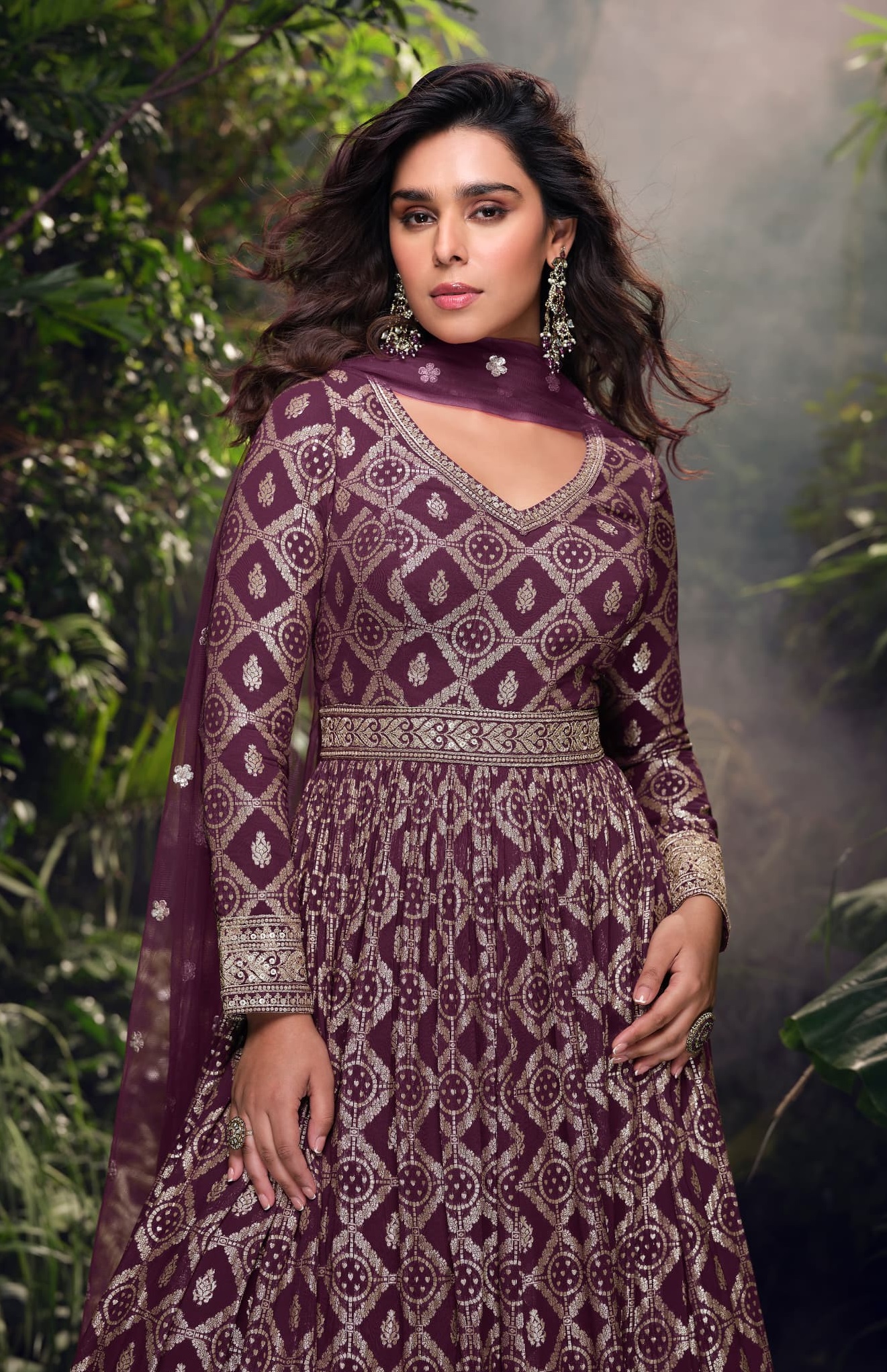 Wine Viscose Simar Jacquard Stiched Hand Made Khatli Work Anarkali Gown (Free Size)