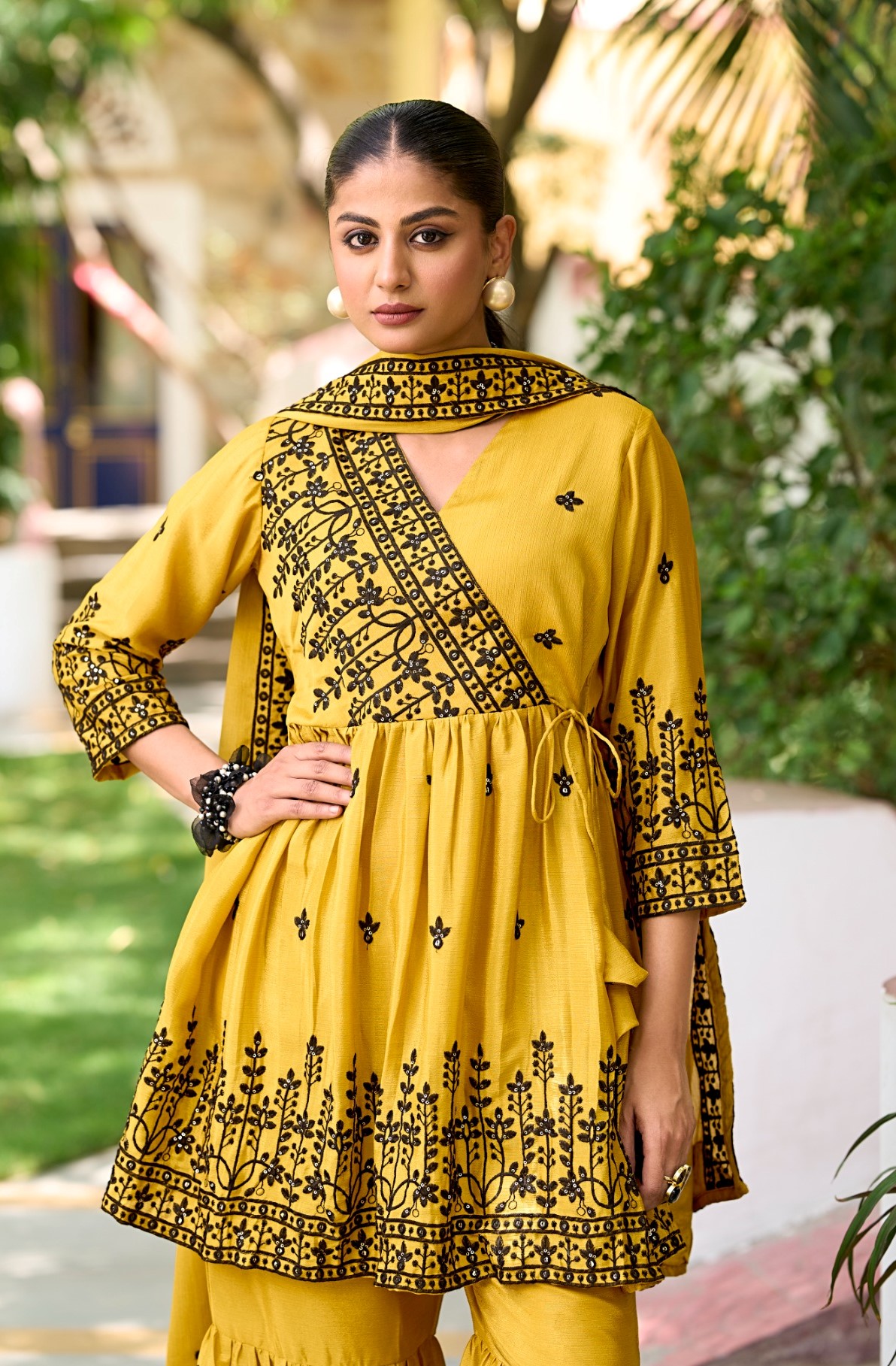 Yellow Chinon Readymade Sharara Suit with Embroidery Work