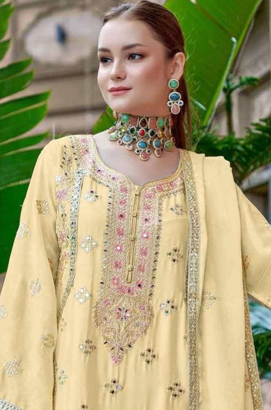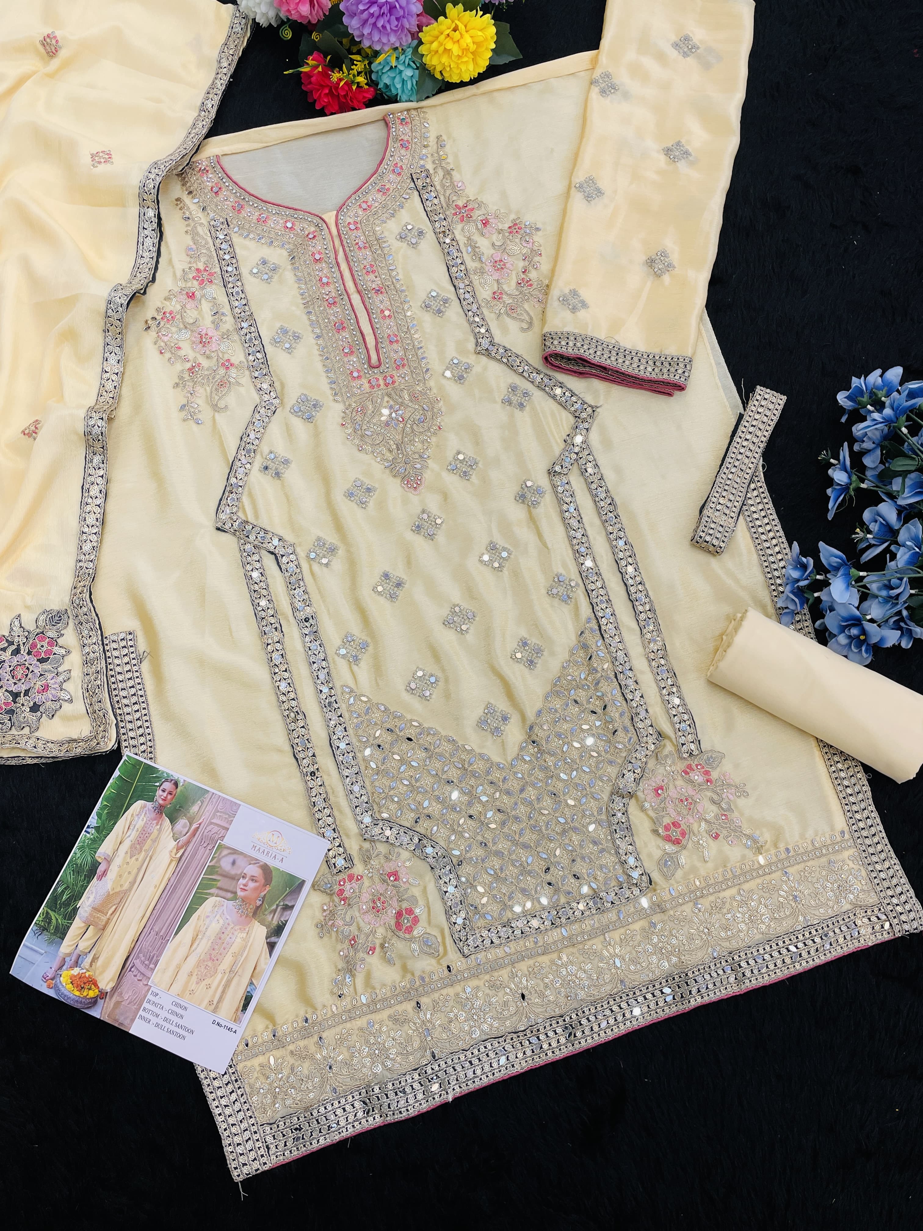 Yellow Chinon With Embroidery Codding Sequence Semi-Stitched Salwar Suit
