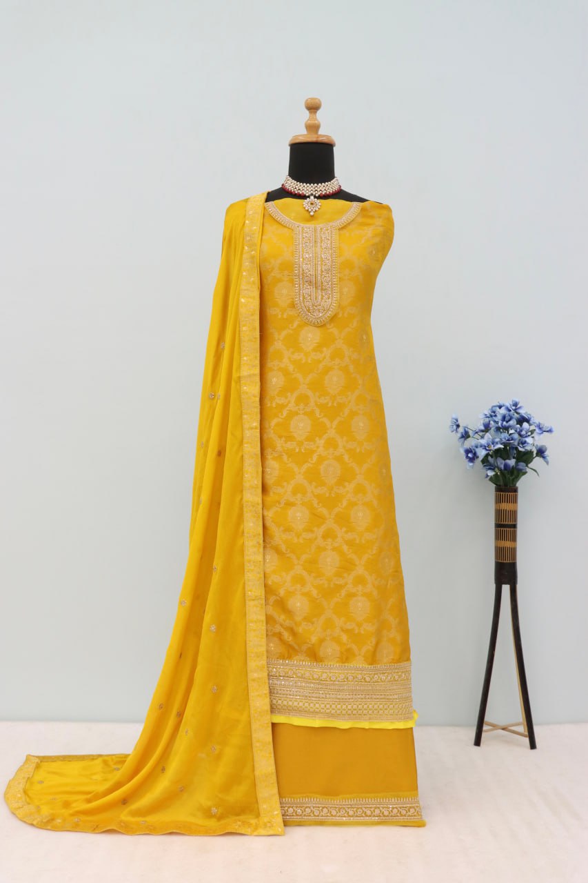 Yellow Dola Silk Thread Sequence Embroidered Semi-Stitched Salwar Suit