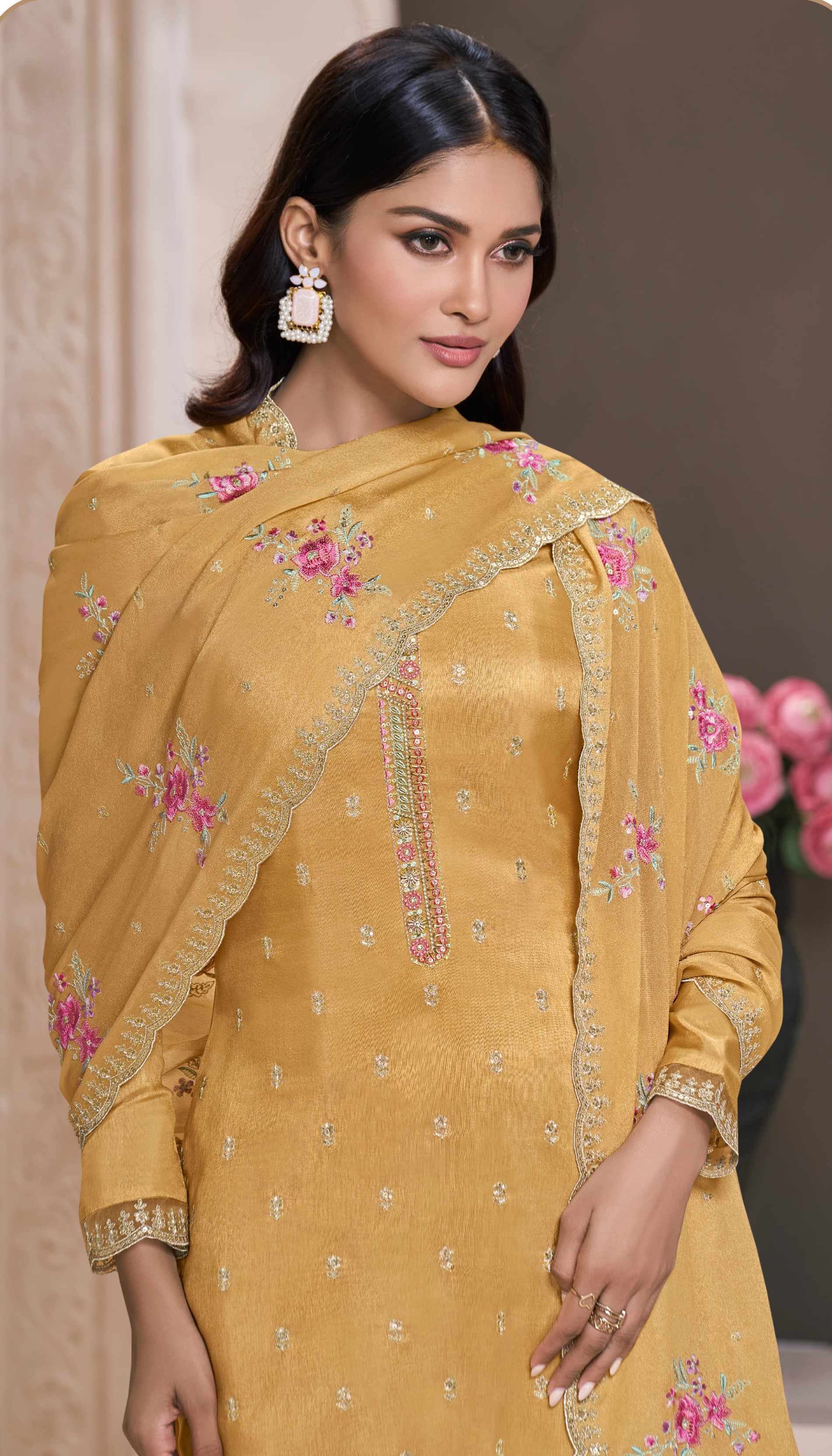 Yellow Silk Embroidered Semi-Stitched Salwar Suit