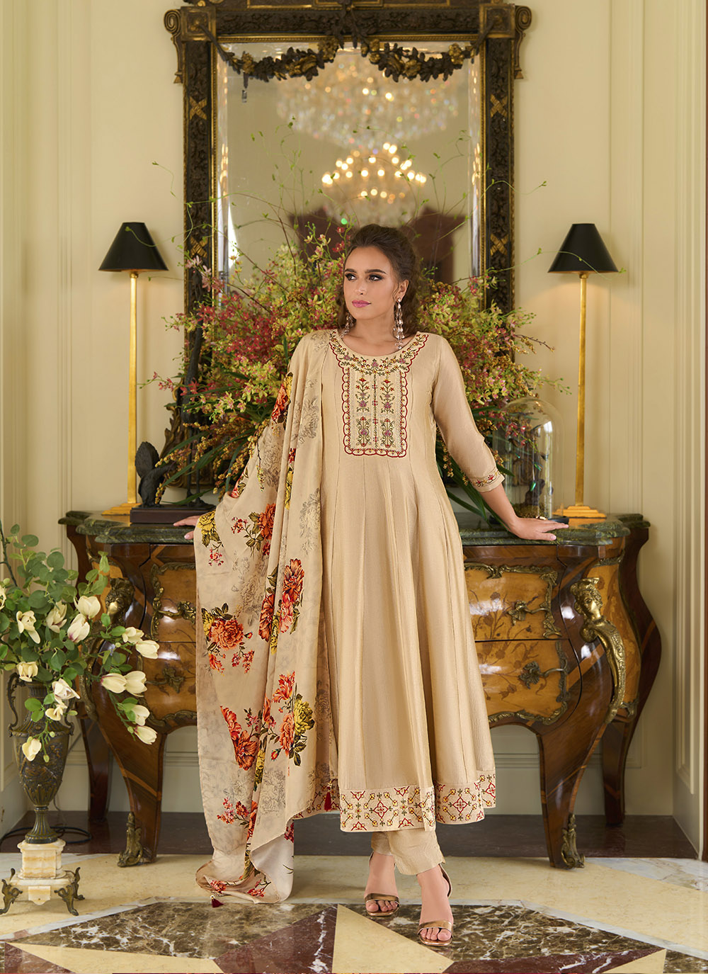 Beige Color Beautiful Embroidered Vichitra Silk Fabric Ceremonial Suit