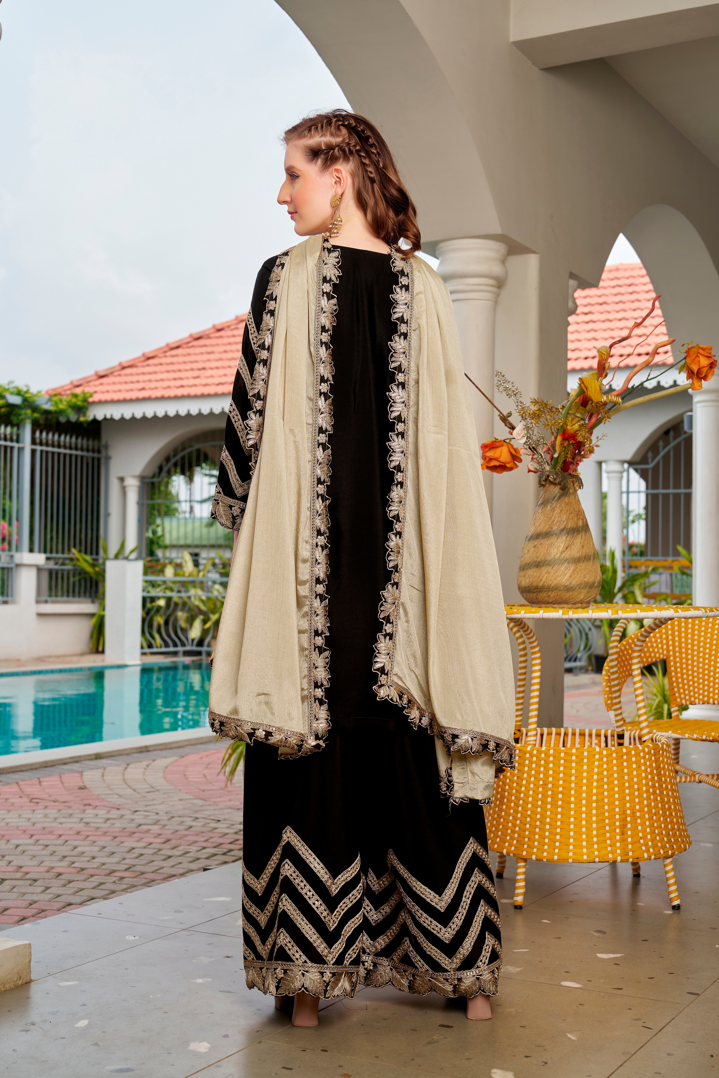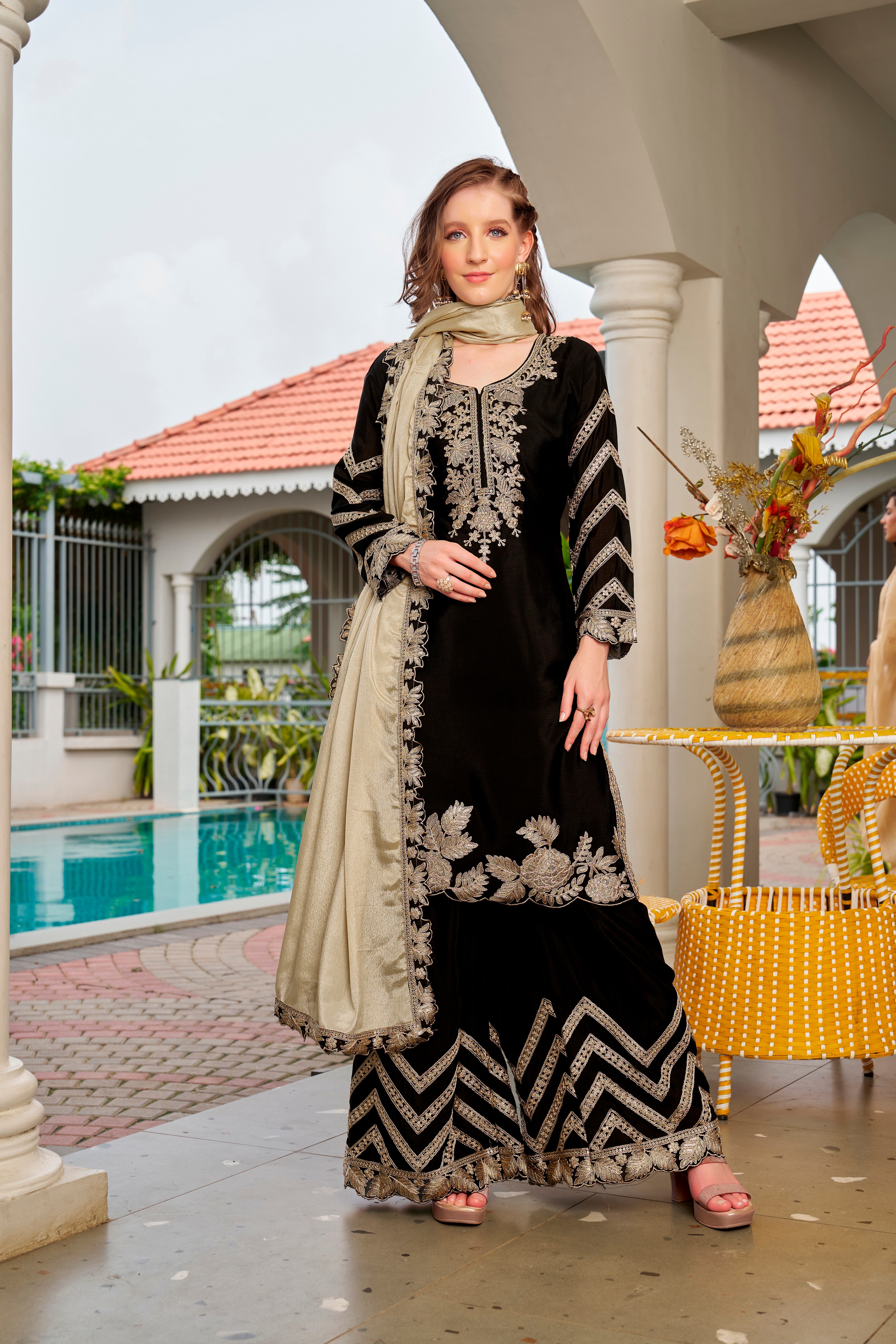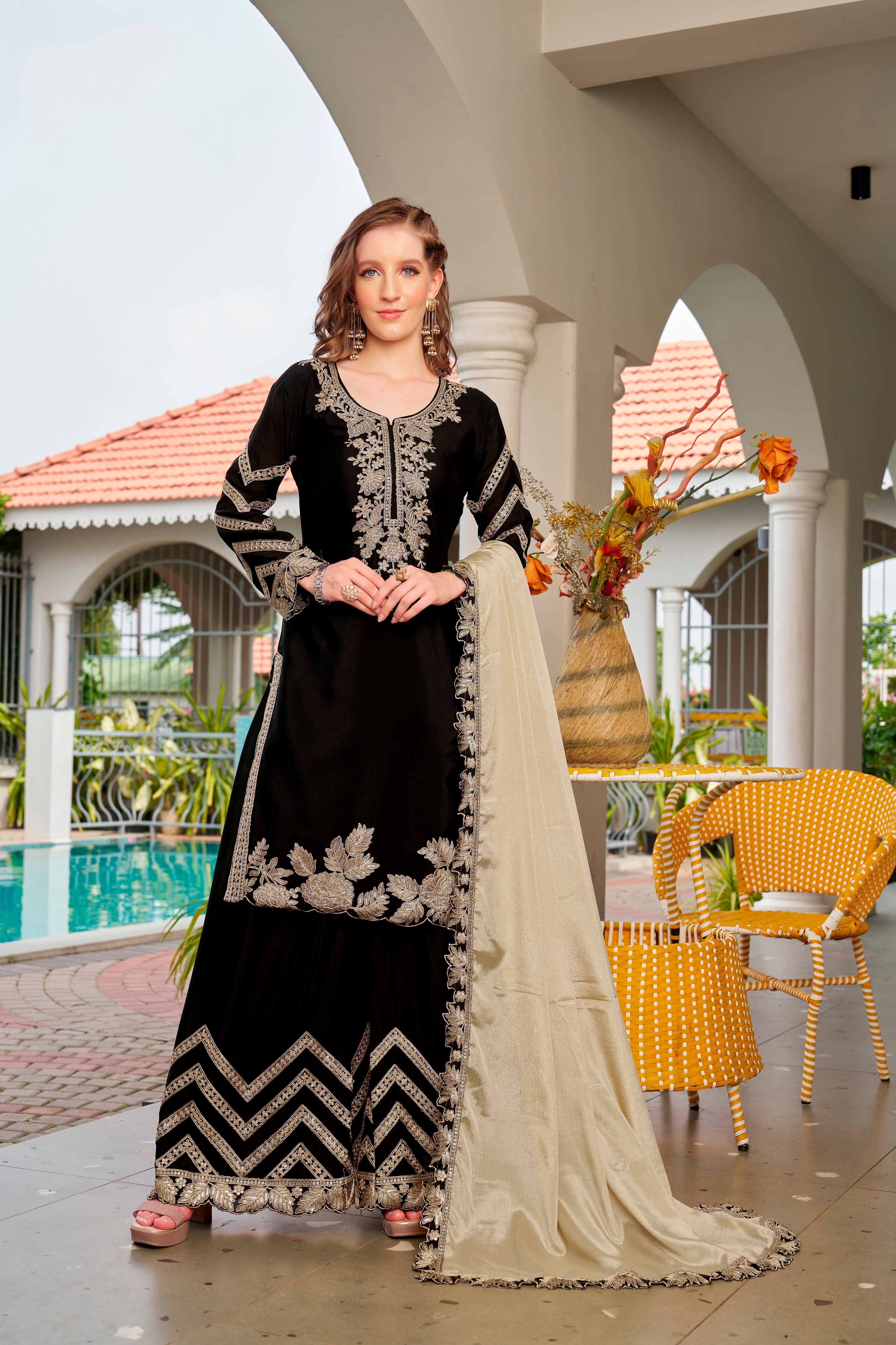 Black Color Chinon Fabric Designer Embroidered Free Size Stithed Suit