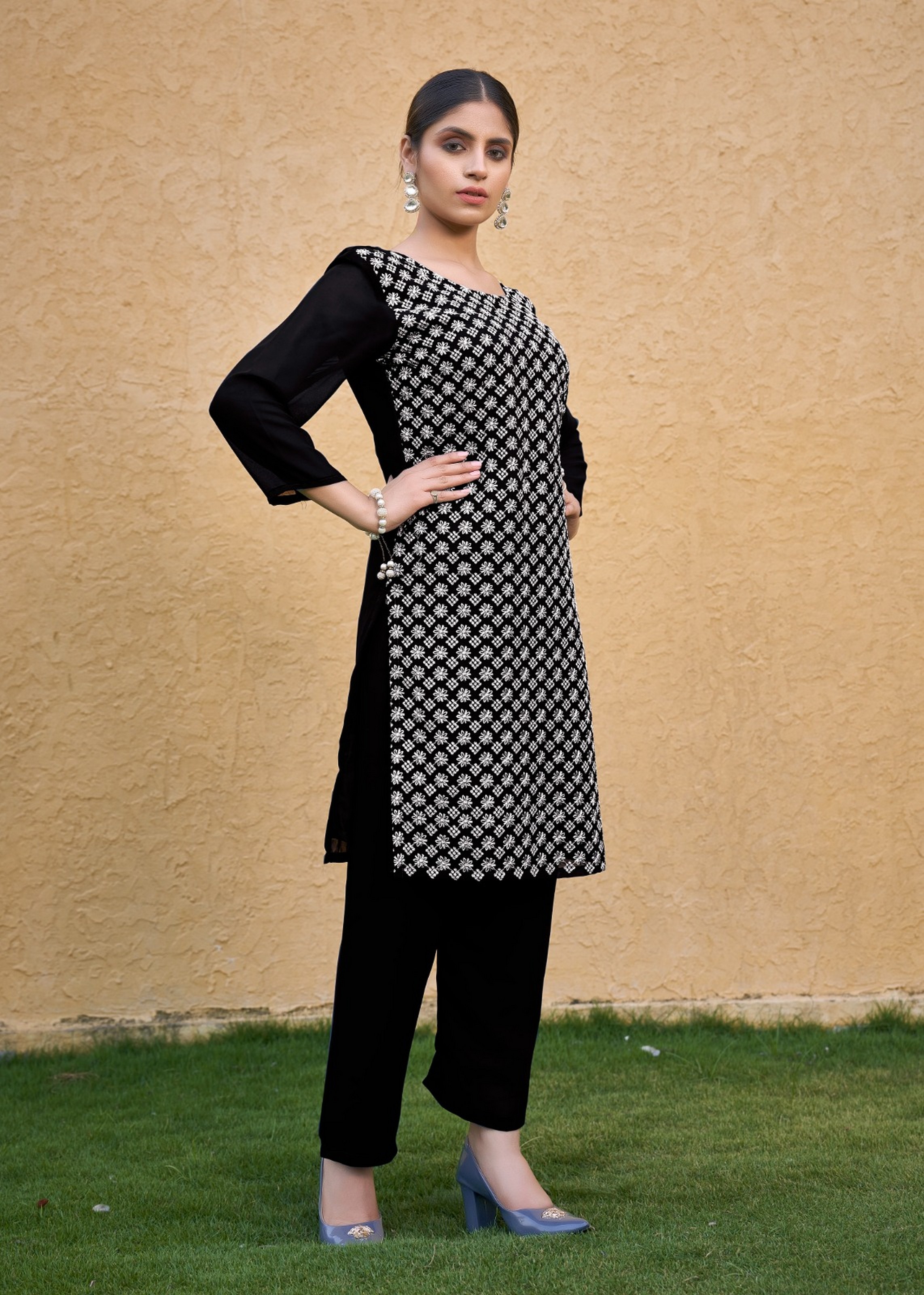 Black Color Thread Embroidery Work Casual Georgette Kurti