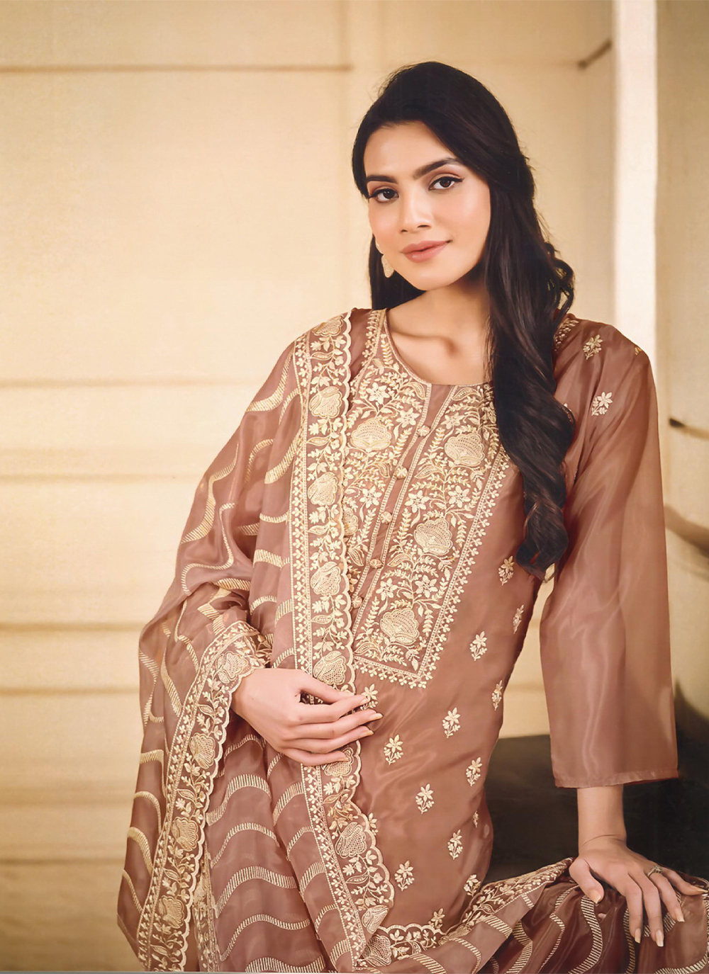Brown Color Elegant Organza Fabric Designer Embroidered Suit