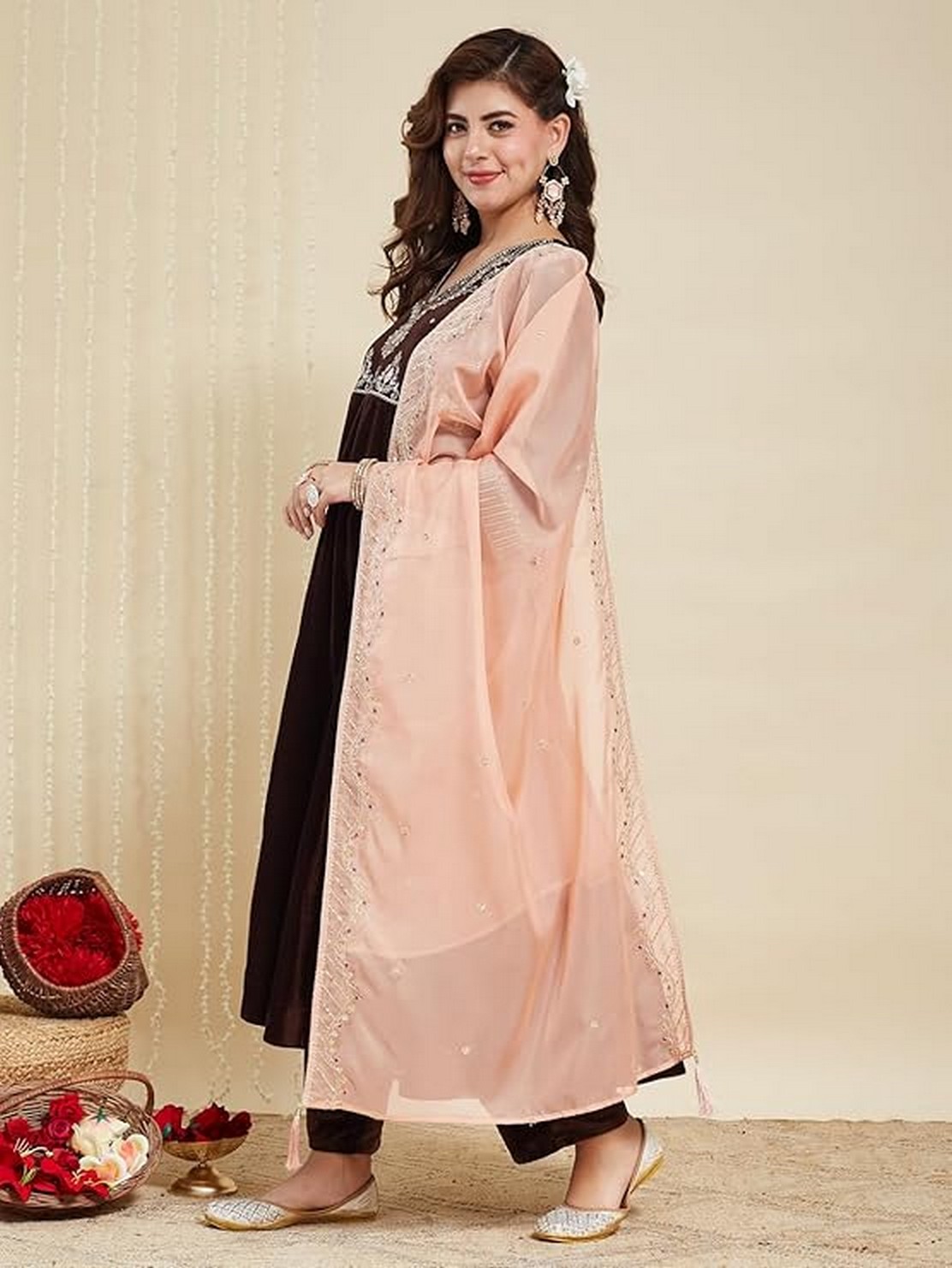 Brown Color Ethnic Velvet Fabric Party Looks Salwar Kameez For Girls