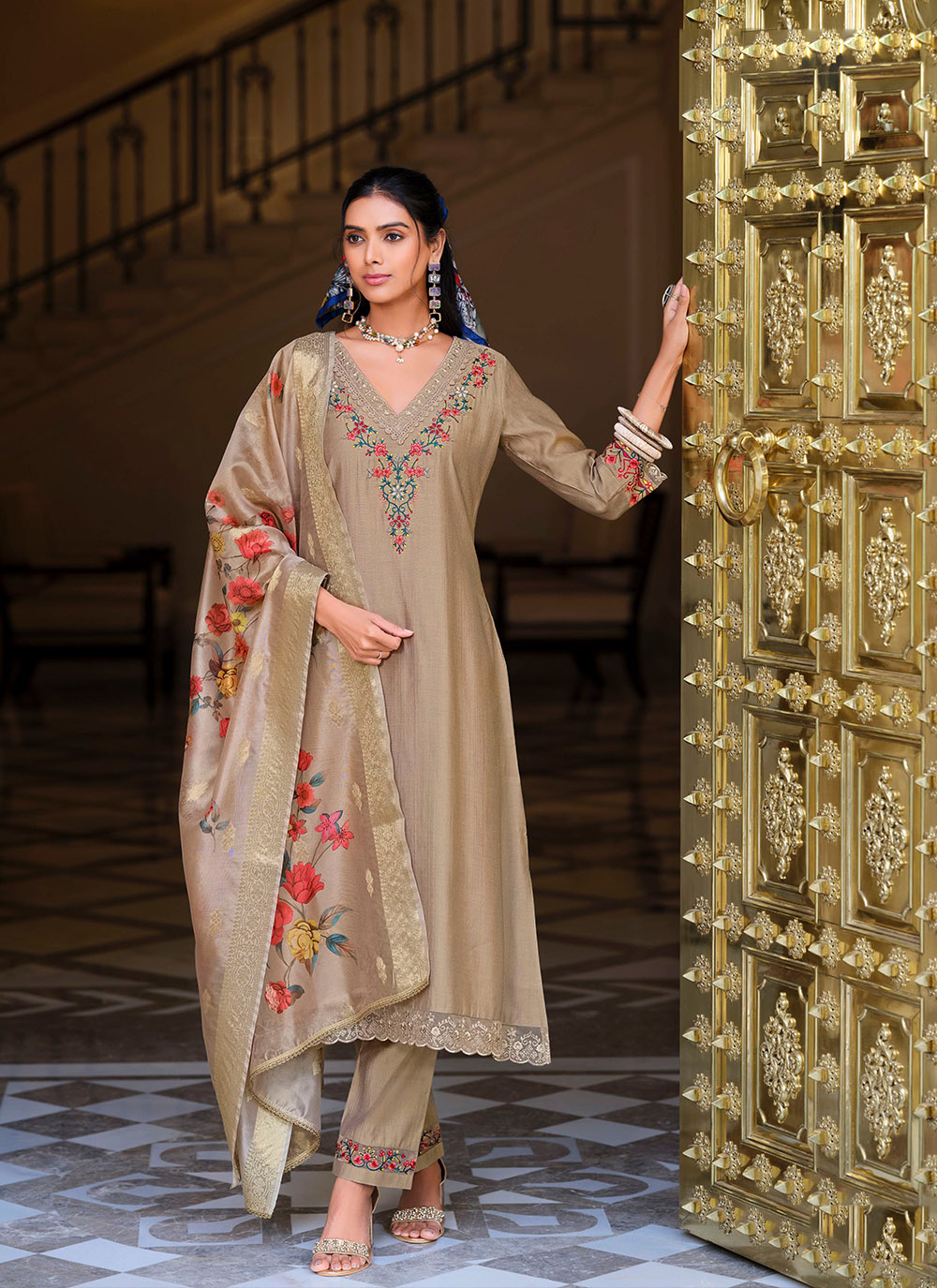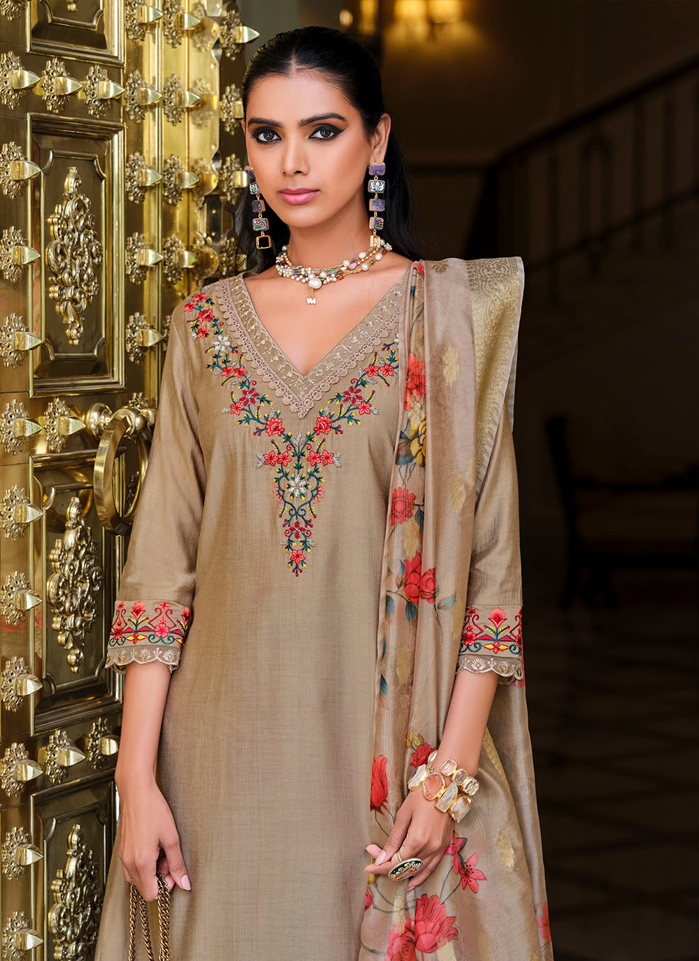 Brown Color Viscose Fabric Designer Embroidered Readymade Suit