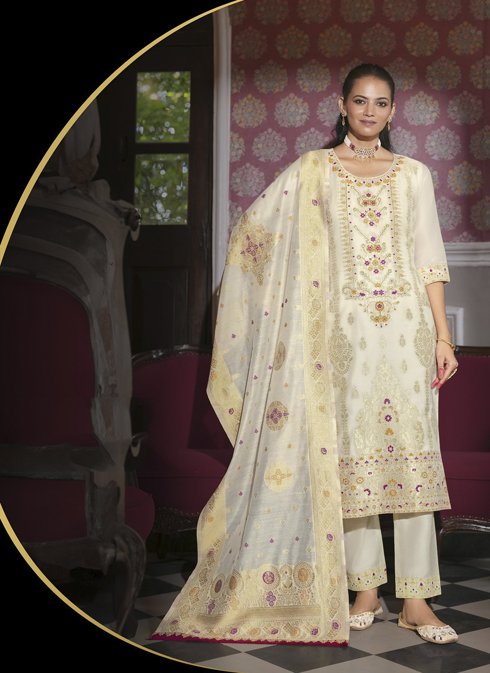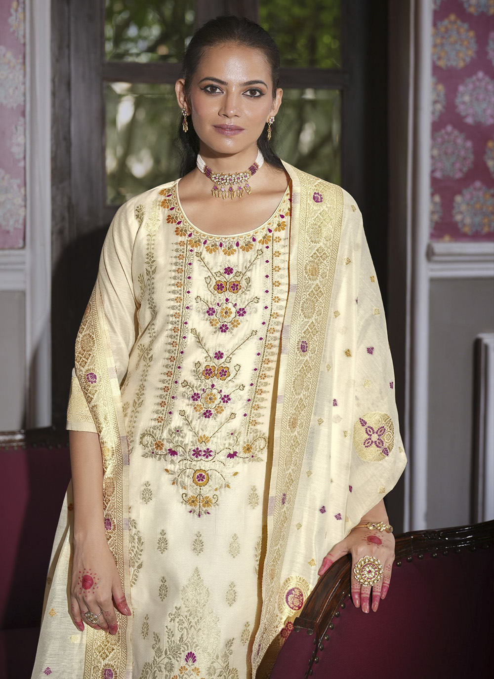 Cream Color Ethnic Woven Designer Banarasi Silk Beautiful Readymade Suit