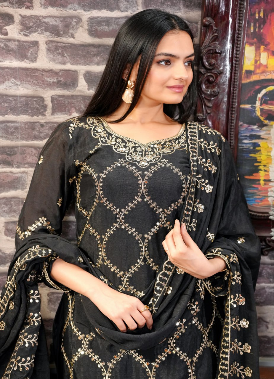 Designer Ethnic Gown Set with Dupatta Chinon Fabric Sequence Embroidery Work for Women – Black Color