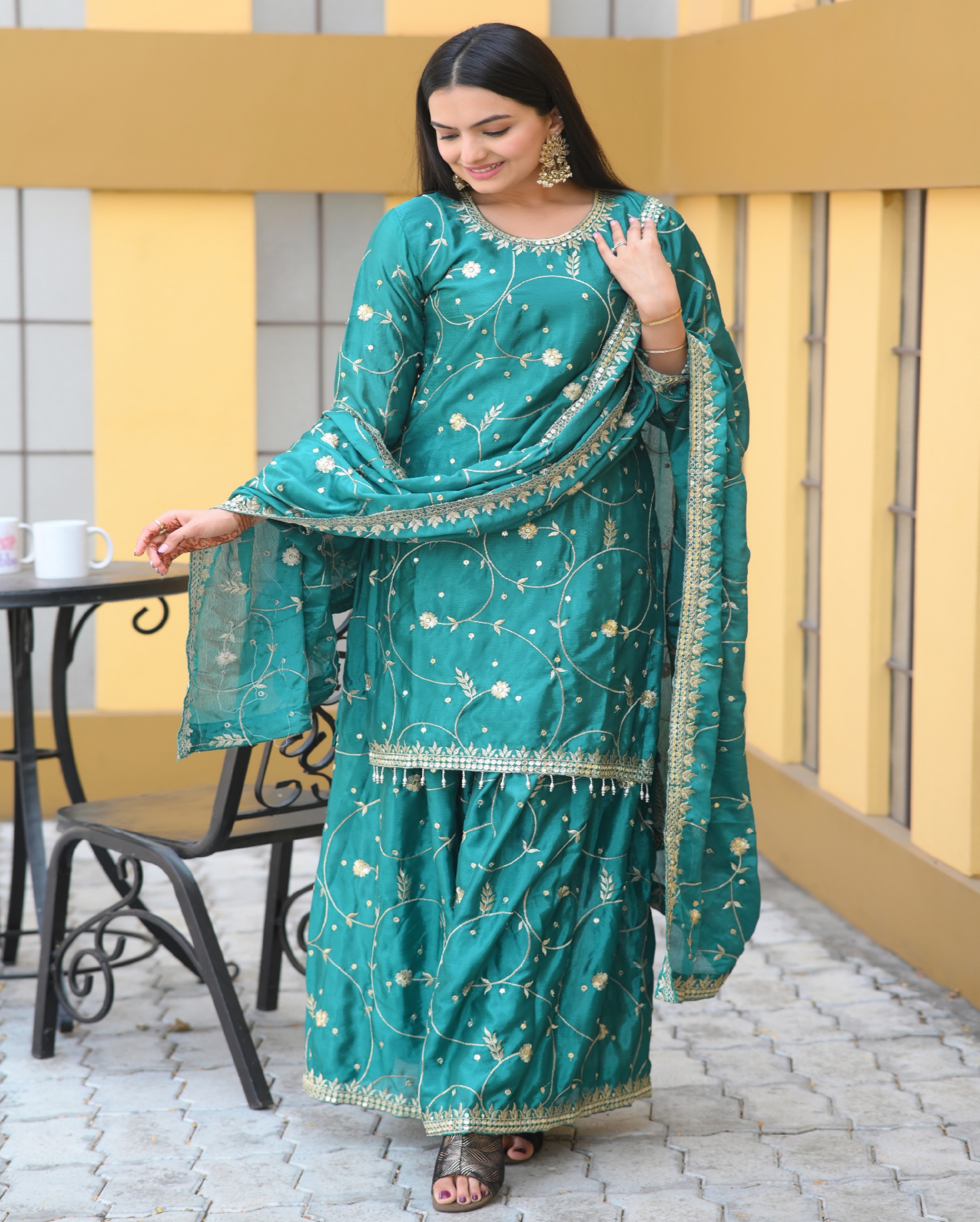 Top, Fabric : Chinon, Inner : Micro, Work :Sequence Embroidery Work, Top length : 38 inch, Stich : S(36), M(38), L(40), XL(42)XXL(44), SHARARA, Fabric: Chinon With Embroidery Work, Inner : Micro, Stich :- Full Stich With Elastic, Bottom Length: 40 inch, Dupata, Fabric : Chinon, Work. : Sequence Embroidery Work, Length : 2.2 meter.
