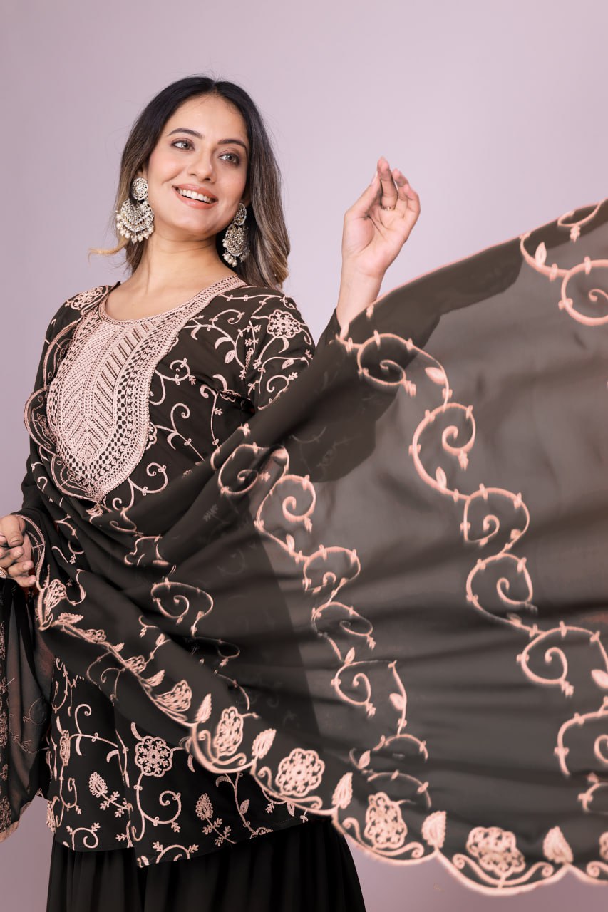 Designer Ethnic Gown Set with Dupatta Fox Georgette Fabric Embroidery Work for Women – Black Color