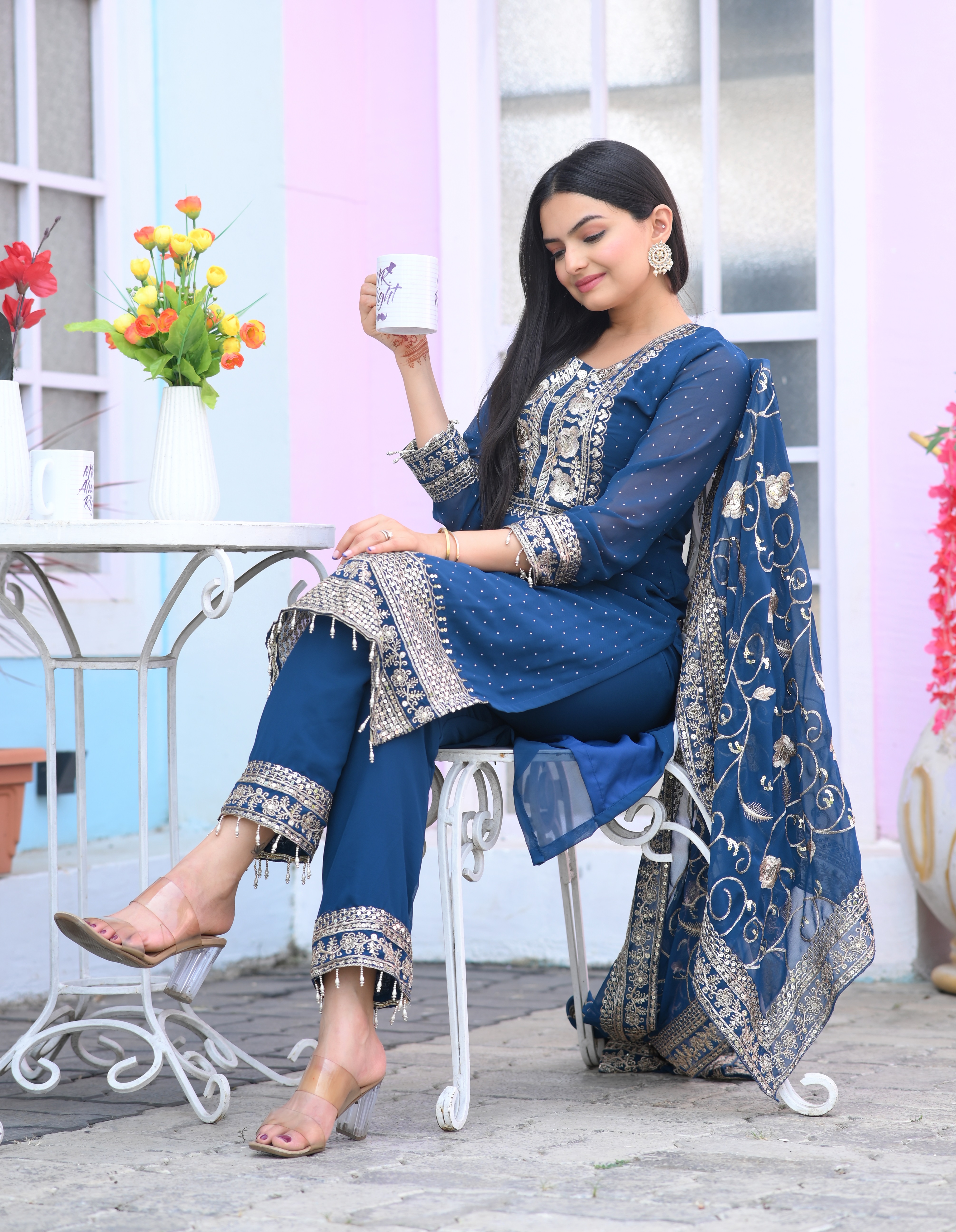 Top, Fabric : Fox Georgette, Inner : Micro, Work : Sequence Embroidery Work And Stone Work, Top length : 46 inch, Stich : S(36), M(38), L(40), XL(42), XXL(44), Pent, Fabric: Fox Georgette, Inner : micro, Stich :- Full Stich With Elastic, Bottom Length: 40 inch, Dupata, Fabric : Fox Georgette, Work. : Sequence Embroidery Work, Length : 2.2 meter.