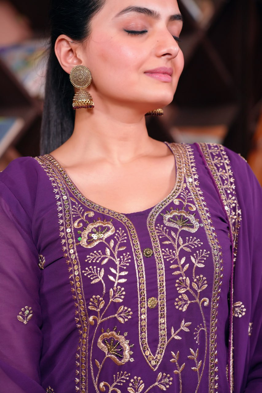 Top, Fabric : Fox Georgette, Inner : Micro, Work : Sequence Embroidery Work, Top length : 41-42 inch, Stich : S(36), M(38), L(40), XL(42), XXL(44), Sharara, Fabric: Fox Georgette, Inner : Micro, Stich :- Full Stich With Elastic, Bottom Length: 40 inch, Dupata, Fabric : Fox Georgette With Heavy Embroidery Work, Work. : Sequence Embroidery Work, Length : 2.2 meter.